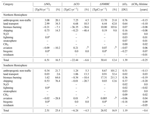 Table 3Overview of difference of the prescribed emissions, the tropospheric O3 column, and the tropospheric CH4 lifetime for the individual tagging categories between the simulations EMIS-02 and EMIS-01. For the contribution of tropospheric CH4 lifetime change, the estimates derived using method 2 are shown (see Sect. 2.4).