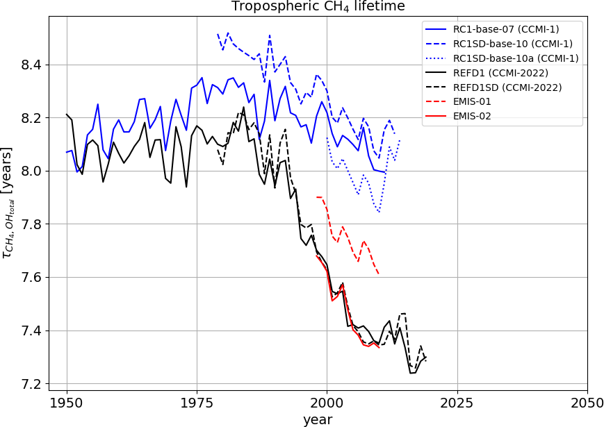 Figure 1Tropospheric CH4 lifetime with respect to the oxidation with OH, , for the EMAC simulations performed for phase 1 of CCMI (CCMI-1) in blue; phase 2 of CCMI (CCMI-2022) in black; and the simulations analysed in the present study, EMIS-01 and EMIS-02, in red. See Jöckel et al. (2016) for details of the set-up of the CCMI-1 simulations and Jöckel (2023) for REFD1.