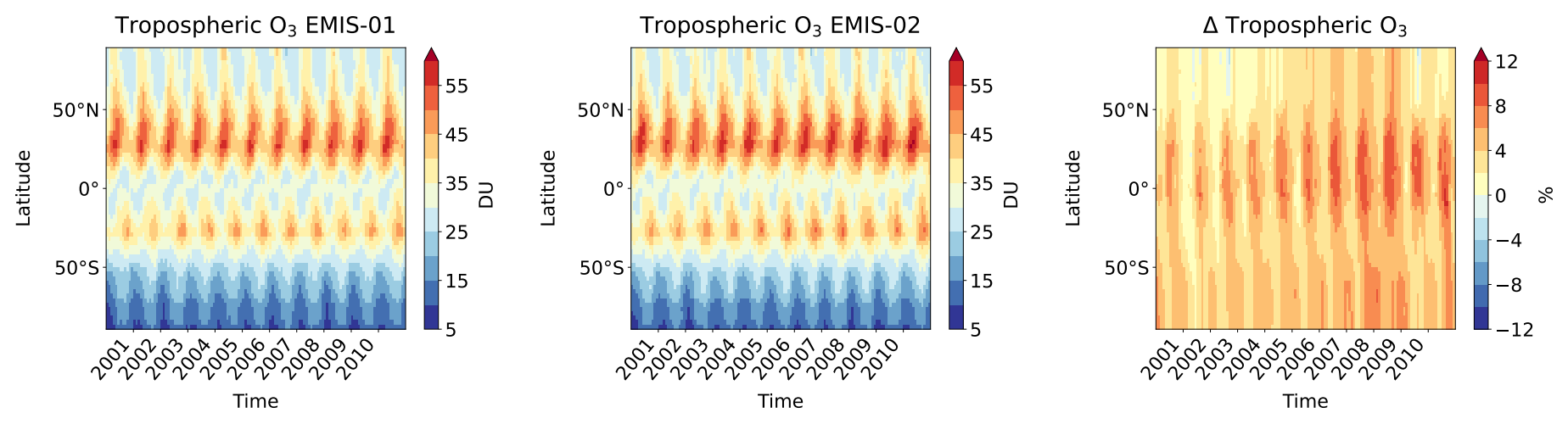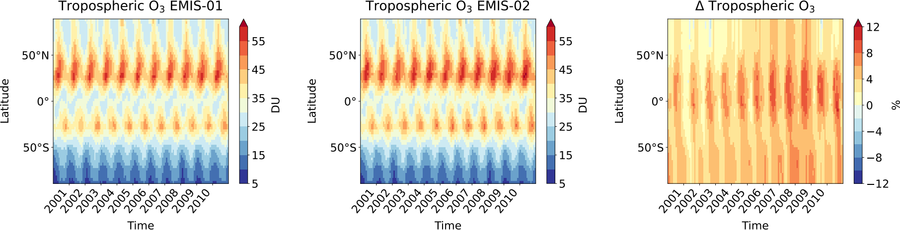 The zonal mean of the total O3 volume mixing ratio in nmol/mol and the relative differences between EMIS-01 and EMIS-02 are shown in Fig. S1 in the Supplement. O3 mixing ratios are larger in EMIS-02 compared to EMIS-01 throughout the troposphere, with a maximum relative difference in the lower levels in the tropics. Figure S3 shows that effective production of O3 is enhanced in EMIS-02 most strongly in lower levels. O3 loss is enhanced as well, however less strongly, so that the net effect is to enhance O3 concentration.