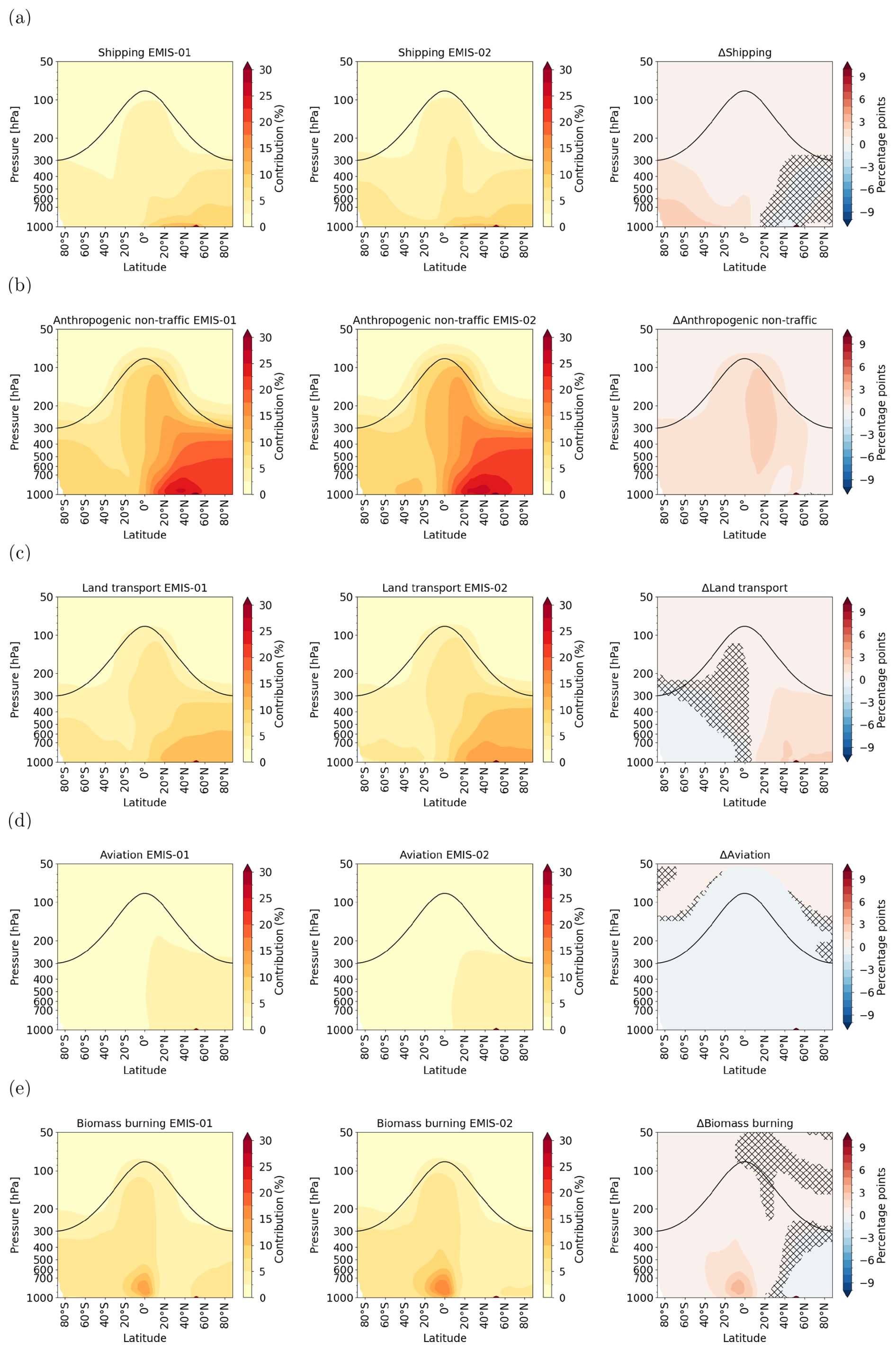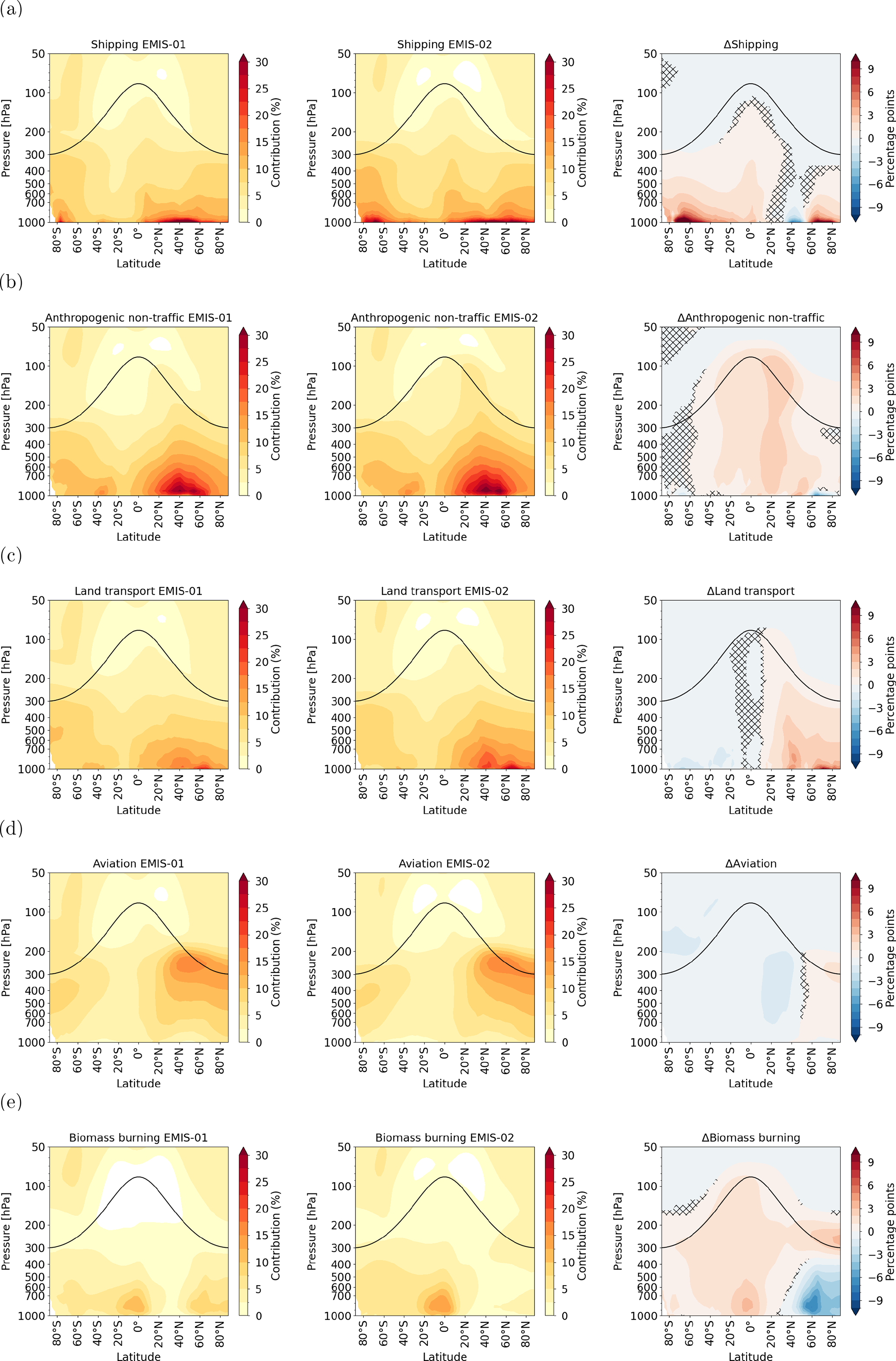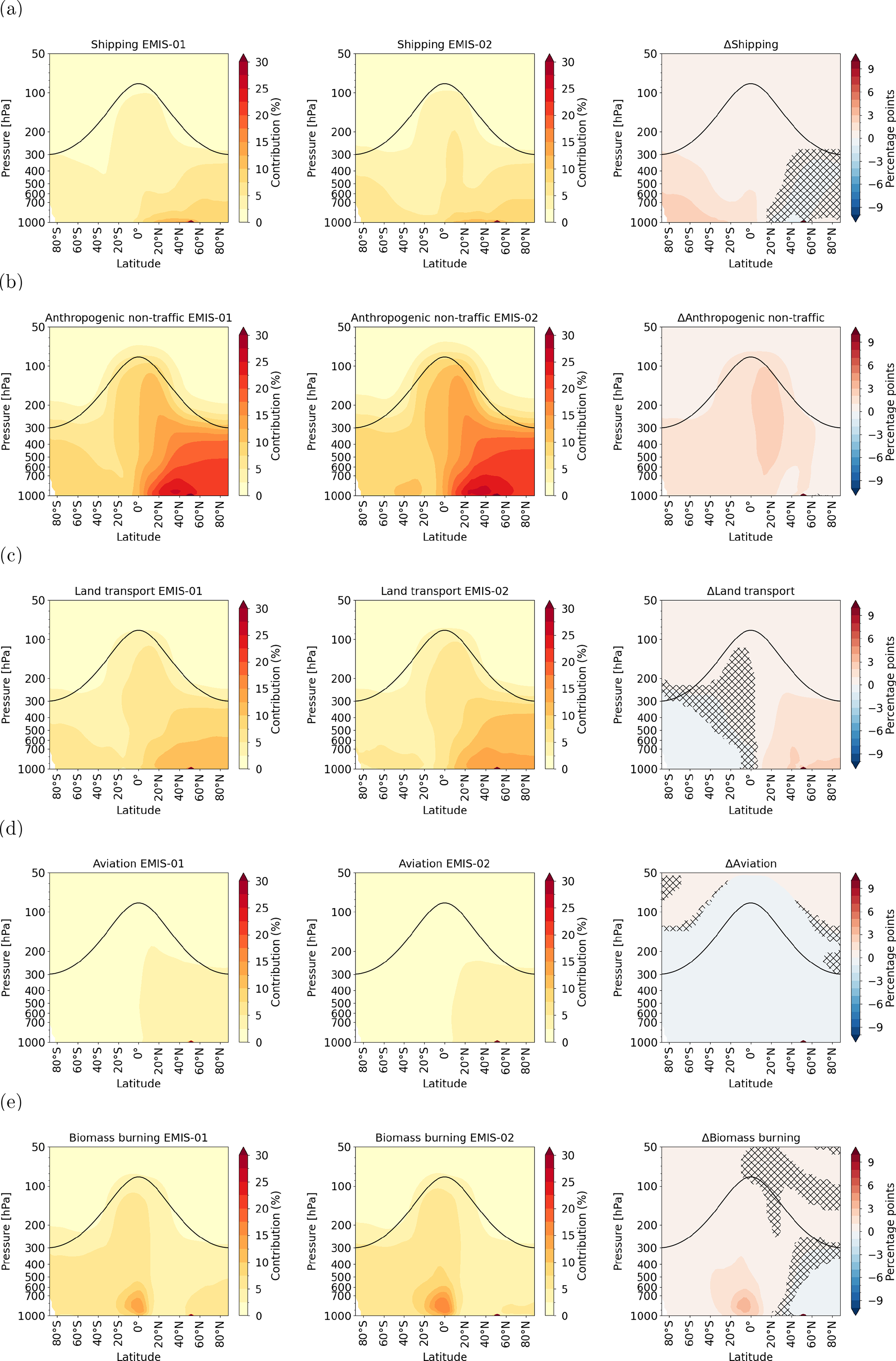 Figure 3Relative contributions to total O3 of the tagging categories (a) shipping, (b) anthropogenic non-traffic, (c) land transport, (d) aviation, and (e) biomass burning. The left and middle columns show the contribution of the respective category in the simulations EMIS-01 and EMIS-02, respectively. The right column shows the differences of the relative contributions to O3 between the two simulations in percentage points. Zonal means of the years 2000–2010 are presented. Hatches in the delta plot indicate a p value ≥0.05 from the dependent t test for paired samples.