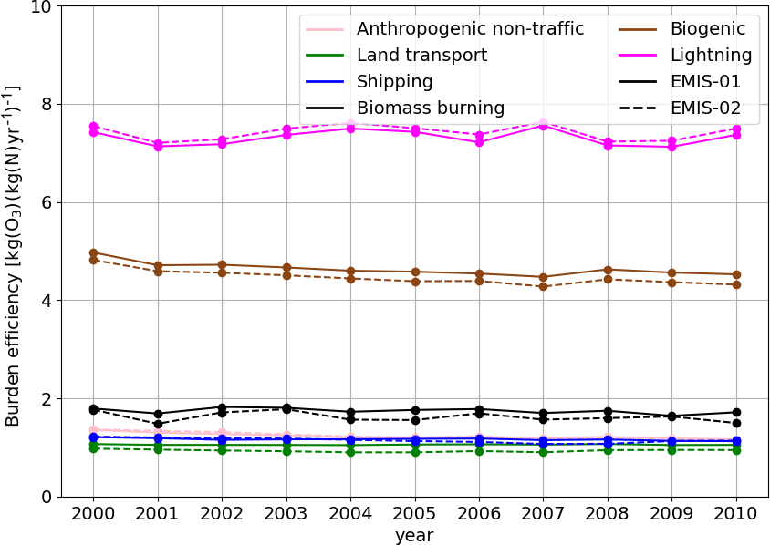 For the categories anthropogenic non-traffic and shipping, the burden efficiency is roughly the same in both simulations, indicating that the larger prescribed NOx emissions result in a correspondingly large increase in the O3 production. For the categories biogenic, land transport, and biomass burning the burden efficiency is smaller in the simulation EMIS-02 compared to EMIS-01. For the category biogenic, this implies a reduced O3 production from identical biogenic soil NOx emissions as the online calculated emissions are identical per set-up definition (see Sect. 2.1). For the categories land transport and biomass burning, the NOx emissions, as well as the O3 burden, are enhanced in the simulation EMIS-02. However, the emissions and the O3 burden do not increase uniformly with each other, due to the non-linearity of the O3 chemistry. For the category lightning on the contrary, the burden efficiency is larger in the simulation EMIS-02 compared to EMIS-01, likely due to the differences in the aviation emissions. The lightning NOx emissions are identical in the two simulations, but O3 is produced more efficiently in the simulation EMIS-02.
