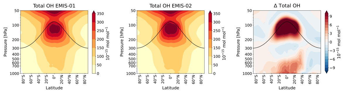 Figure 5 shows the zonal mean mixing ratios of OH in both simulations, as well as their difference. The largest differences are located around the tropical tropopause, where the tropospheric OH mixing ratio is largest and larger OH mixing ratios are shown in the simulation EMIS-02 compared to EMIS-01. The OH mixing ratios are also larger in the lower (up to about 500 hPa) tropical troposphere in EMIS-02 but smaller between 500 and 300 hPa. To complement Fig. 5, Fig. S6 in the Supplement shows the zonal mean number concentration of OH weighted by the reaction with CH4 (see Eq. 2). The zonal mean distribution of weighted OH is similar in both simulations with maxima in the tropical tropopause region and in the lower tropical troposphere. The OH concentration is larger in EMIS-02 compared to EMIS-01 in both of these regions, consistent with the difference of OH mixing ratios shown in Fig. 5.