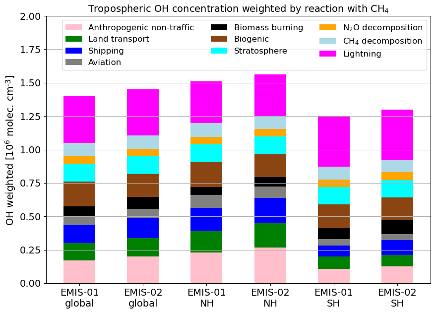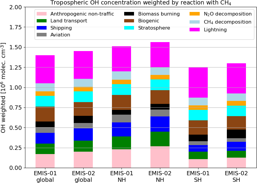 The global tropospheric CH4-weighted OH is enhanced in the categories anthropogenic non-traffic (+0.03 × 106 molec. cm−3), land transport (+0.01 × 106 molec. cm−3), shipping (+0.02 × 106 molec. cm−3), and biomass burning (+0.02 × 106 molec. cm−3) in EMIS-02 compared to EMIS-01, whereas it is reduced by −0.01 × 106 molec. cm−3 in the categories aviation and biogenic. The global tropospheric OH attributed to the categories stratosphere, N2O, CH4, and lightning remains unchanged in both simulations.