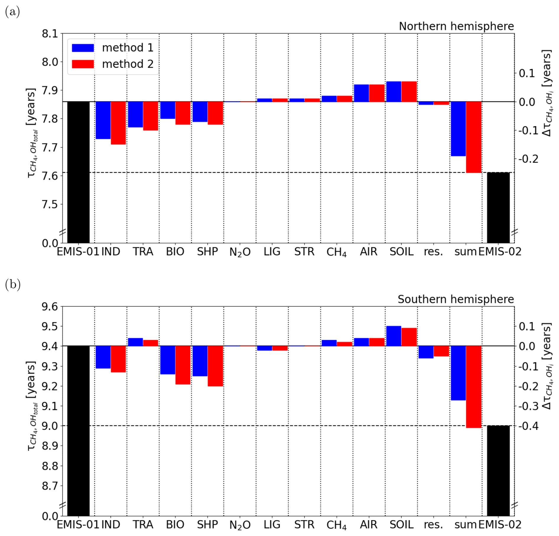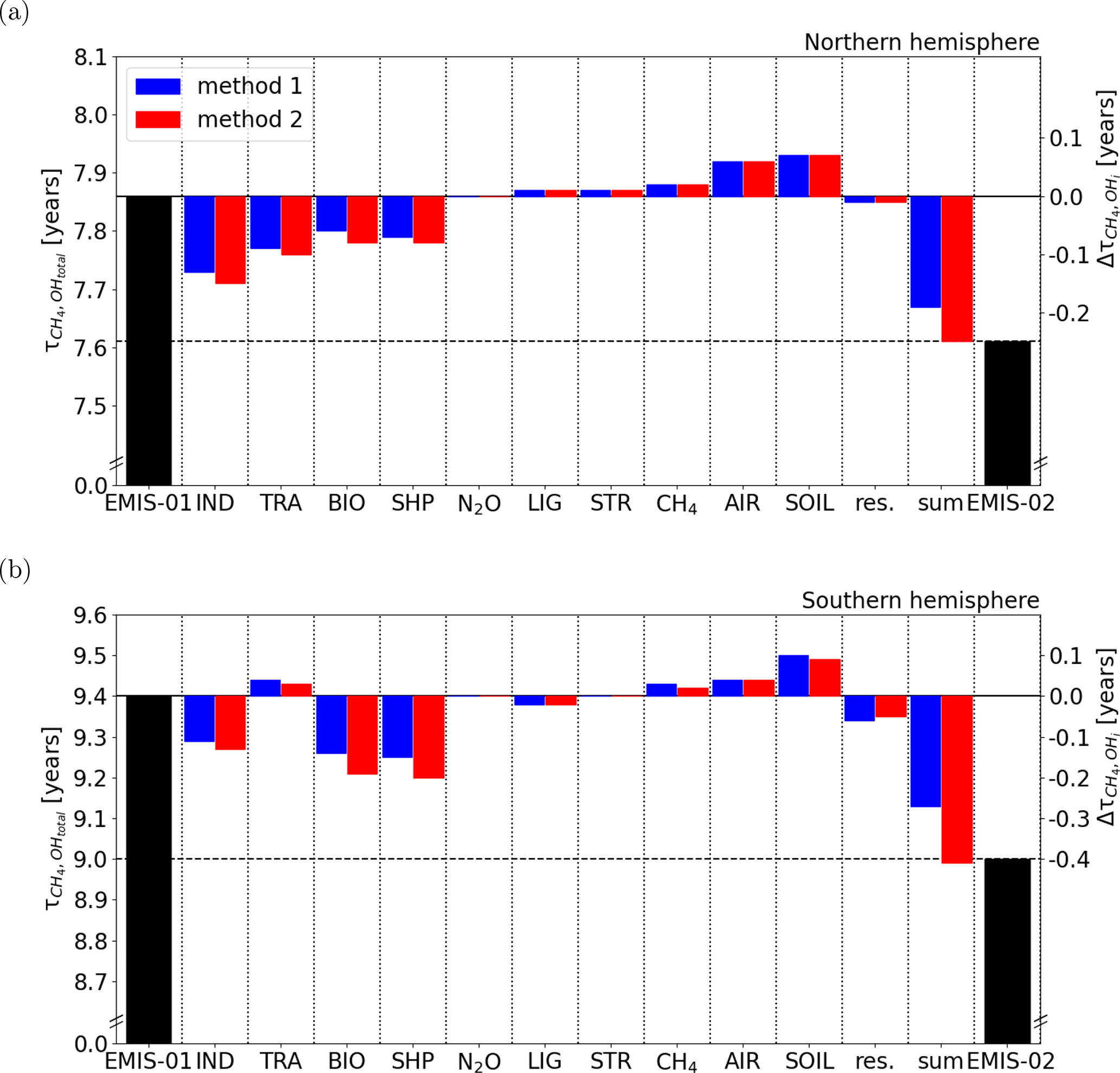 In this section, we attribute the difference of the tropospheric CH4 lifetime with respect to the oxidation with OH in the simulations EMIS-01 and EMIS-02 to individual tagging categories. We show results for the NH and SH separately. The black bars in Fig. 8 show the CH4 lifetime with respect to the oxidation with total OH. In the NH, the absolute difference of the CH4 lifetime with respect to total OH between the simulations EMIS-01 (7.86 years) and EMIS-02 (7.61 years) is −0.25 years, which corresponds to −3.2 %. In the SH, the CH4 lifetime of the simulation EMIS-01 (9.40 years) and EMIS-02 (9.00 years) differs by −0.4 years, which corresponds to −4.3 %.