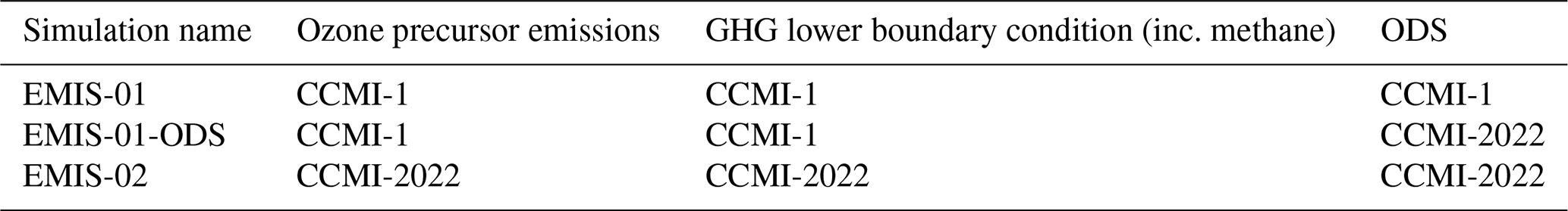 Overall, we performed three different simulations as listed in Table 1, EMIS-01, EMIS-02, and EMIS-01-ODS. The simulation set-up is similar to the set-up of the CCMI-2022 REFD1SD simulation (hindcast with specified dynamics), but we deviate from the CCMI naming convention to clarify that we have performed the simulations specifically for this publication and that they are not identical to the simulations originally performed for CCMI-1 and CCMI-2022. The simulations EMIS-01 and EMIS-02 differ between the emission inventories used for shorter-lived chemical species (i.e. NOx, CO, SO2, NH3, and volatile organic compounds (VOCs); see Sect. 2.2 for more details), the prescribed lower boundary mixing ratios of GHGs (in particular also CH4), and the prescribed lower boundary mixing ratios of ozone-depleting substances (ODS) (see Jöckel et al., 2016, for more details). The global mean surface CH4 mixing ratio is about 0.01 ppm larger in the simulation EMIS-02 compared to EMIS-01 (see Fig. S12 in the Supplement), which is expected to cause a small extension of the CH4 lifetime, which counteracts the overall shortening of the CH4 lifetime. The prescribed lower boundary for N2O is nearly identical, which is also reflected by the total mass of N2O (see Fig. S13 in the Supplement). The influence of the change in the prescribed ODS turned out to have no influence on the tropospheric CH4 lifetime and only a small influence on tropospheric O3 (see Fig. S2 in the Supplement). Therefore, only the simulations EMIS-01 and EMIS-02 are further analysed in our study.