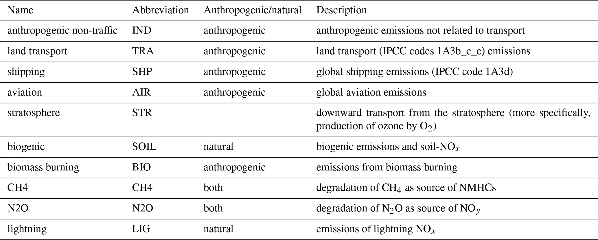 Table 2Overview of the categories for the tagging source attribution applied in this study. Detailed definitions of the categories are given by Grewe et al. (2017). The anthropogenic non-traffic category contains all non-traffic-related activities, i.e. industry, households, energy, and agriculture including agricultural waste burning.