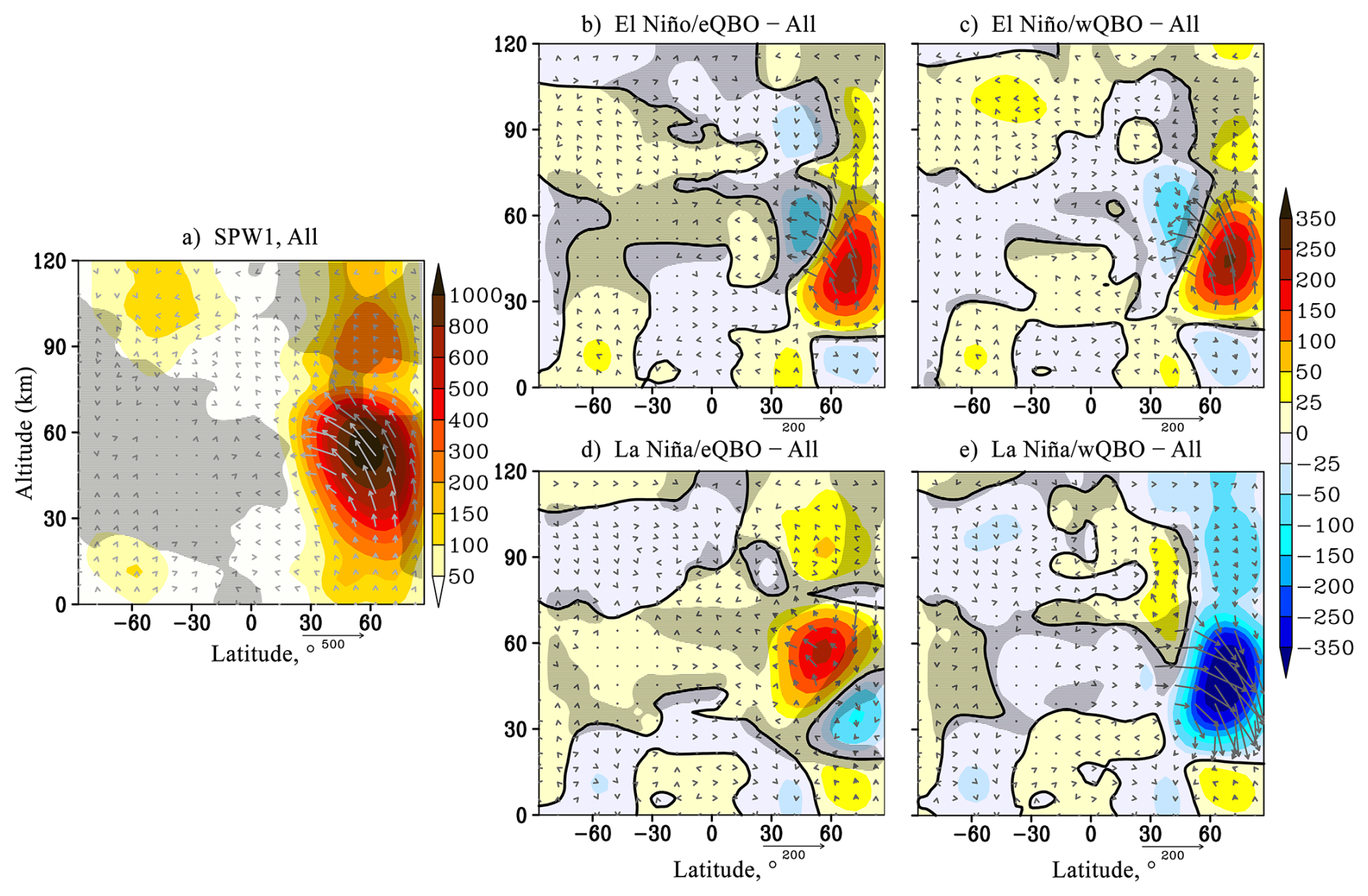 • Similar features in the SPW1 and SPW2 amplitude increments at El Niño are modelled in the MLT region, regardless of the QBO phase. Increases of the amplitudes of SPW1 and SPW2 are shown under El Niño phase.