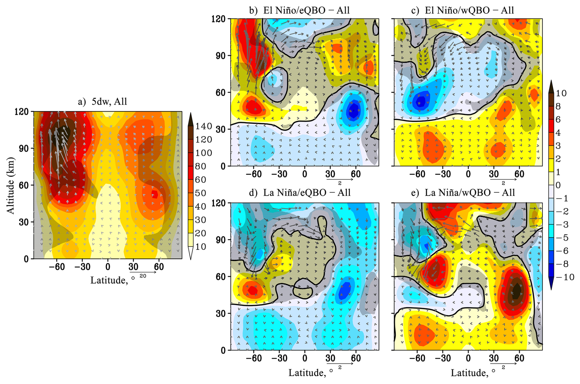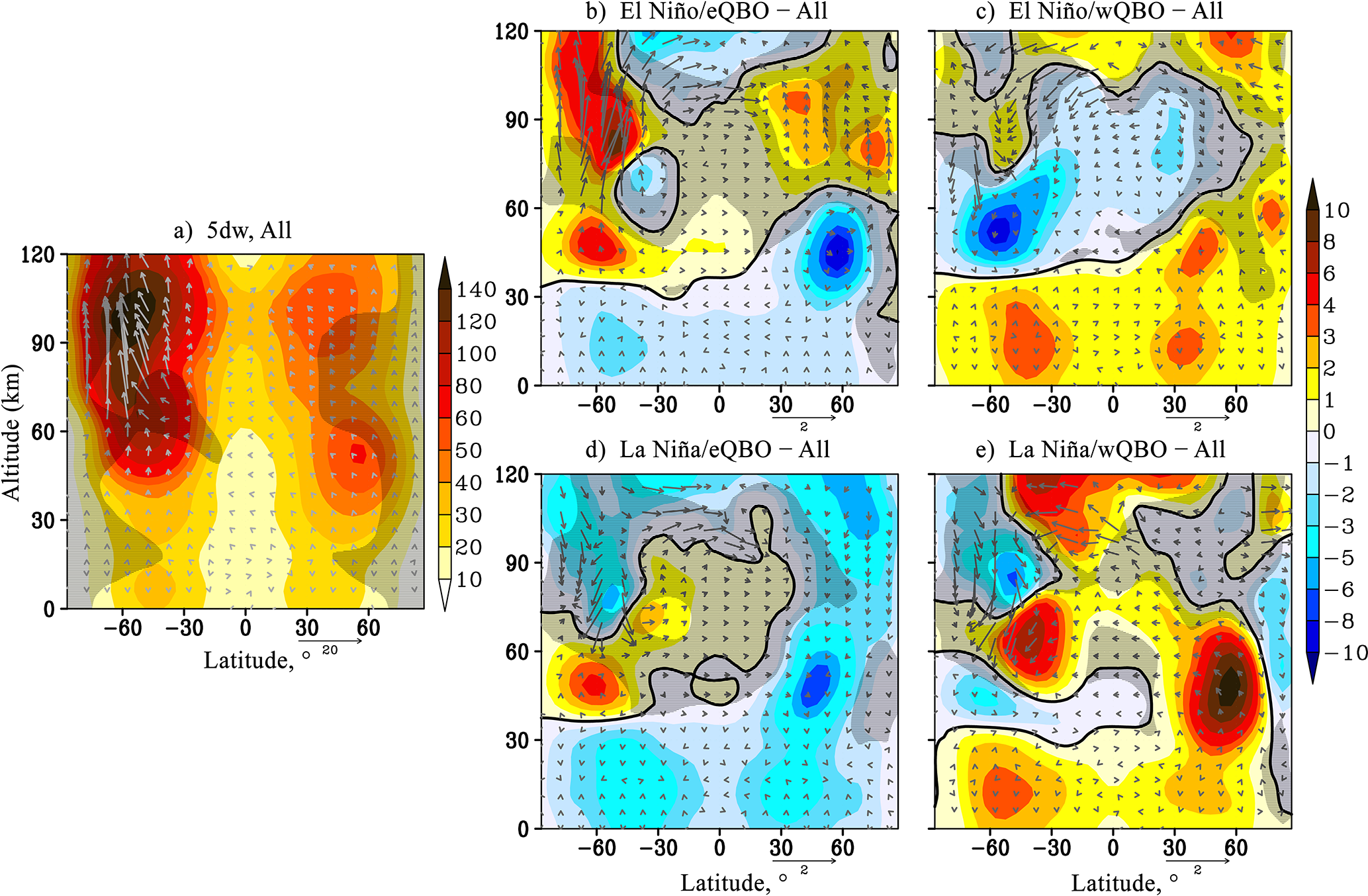 The 5 d NM with m=1 has maximum amplitudes in the mid-latitude mesosphere and the lower thermosphere of the Southern Hemisphere (Fig. 3a), which is consistent with the observational data (Didenko et al., 2024). In addition, significant amplitudes of this wave are modelled in the equatorial and mid–latitude lower thermosphere and the mid-latitude stratosphere. Apart from these, under various combinations of ENSO and QBO conditions in the region of the climatic maximum the 5 d NM amplitude varies slightly. The amplitude attenuation by  10 % is observed under eQBO at the middle latitudes above 100 km in the Southern Hemisphere and at 50 km in the Northern Hemisphere – Fig. 3b and d. The 5 d NM amplitude increases by 10 % under the wQBO in the same regions – Fig. 3c, e. An increase in the horizontal transfer of wave activity flux from the Southern Hemisphere to the Northern Hemisphere is observed at eQBO, and vice versa at wQBO, regardless of the ENSO phase at a level of about 80–120 km. An increment/decrement of the upward EP flux in the high-latitude southern thermosphere is modelled under a combination of El Niño/eQBO and El Niño/wQBO, respectively. Figure 3e shows an increase of 5 d PW amplitude during La Niña/wQBO in the area of a significant SPW weakening in the northern stratosphere (Fig. 1e). The assessment of the QBO effect only when comparing the middle and right panels of Fig. 3 shows the weakening of 5 d PW during eQBO (middle panels) versus wQBO (right panels) up to 40 km in the Southern Hemisphere and up to 60 km in the Northern Hemisphere, which corresponds to our previous estimates presented in Koval et al. (2022a).