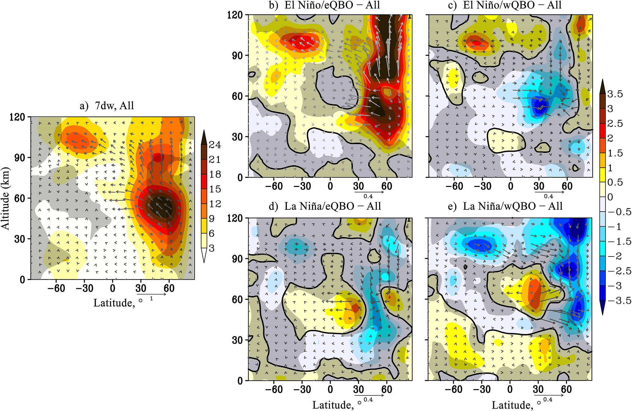 The amplitude distribution similar to 10 d NM is typical for 7 d NM with m=2, but with smaller amplitudes – Fig. 5a. A statistically significant increase in the amplitudes of 7 d PW in the areas of its maxima and upward EP flux increments are seen under El Niño/eQBO conditions. At the same time, the anomaly can reach 30 % in some areas. These positive anomalies are balanced by negative ones under the rest of ENSO/QBO combinations. The greatest decrease of the 7 d NM amplitudes in the regions of its maxima and downward EP flux increments are modeled under the La Niña/wQBO conditions. The interhemispheric transfer of wave energy from the winter hemisphere to the summer hemisphere above 70 km is the strongest under El Niño/eQBO and the weakest under La Niña/wQBO conditions. Below this level in the low-latitude stratosphere, increase in southward EP flux and PW amplitudes are registered during La Niña phase for both QBO (Fig. 5d, e). Opposite tendency is shown under El-Niño/wQBO in Fig. 5c.