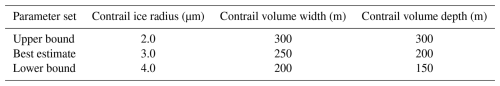 Table 1Initial contrail microphysical parameter sets used in CASIM contrail simulations. The table presents values for contrail ice crystal radius (µm), contrail volume width (m), and contrail volume depth (m) for three simulations.