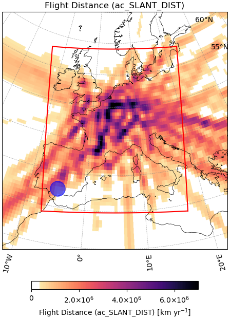Figure 1Flight distance in km yr−1 from AEDT air traffic inventory at 197 hPa over the European domain considered in this study. The red box outlines the CASIM-UM European domain and the blue dot marks the location of the contrail cluster in the idealised contrail cluster experiment.