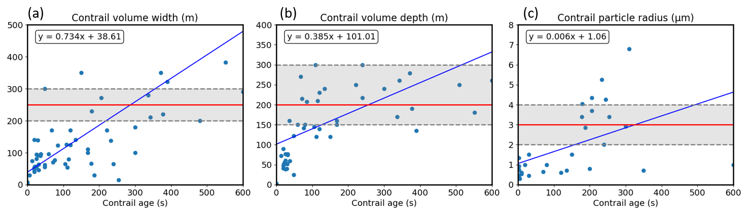 Figure 2Scatterplots of contrail microphysical properties from contrail age younger than ten minutes, derived from the COLI library. (a) Contrail volume width, (b) contrail volume depth, and (c) contrail particle radius. The red line indicates the best estimate for each parameter corresponding to a 5 min old contrail, with the grey dashed lines indicating the upper and lower bounds. The blue lines are the linear regression lines.