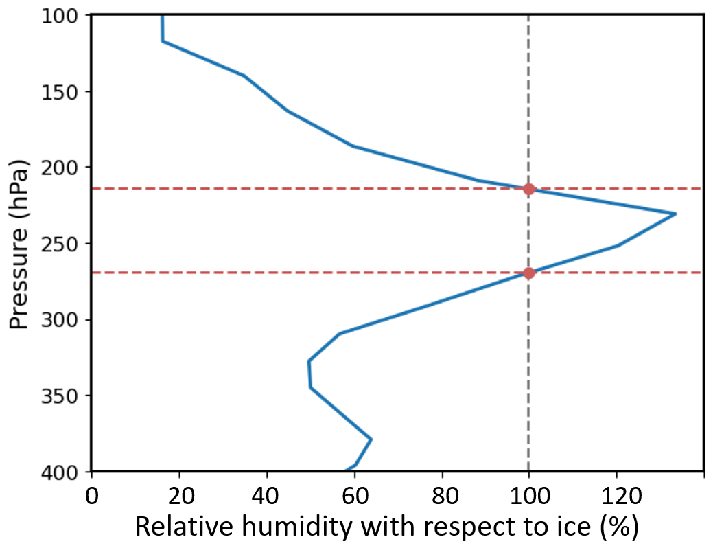 Figure 3Vertical profile of relative humidity with respect to ice (RHice). Red horizontal dashed lines at ∼210 and ∼270 hPa indicate the boundaries of ice supersaturation, i.e. RHice>100 % (vertical dashed line).