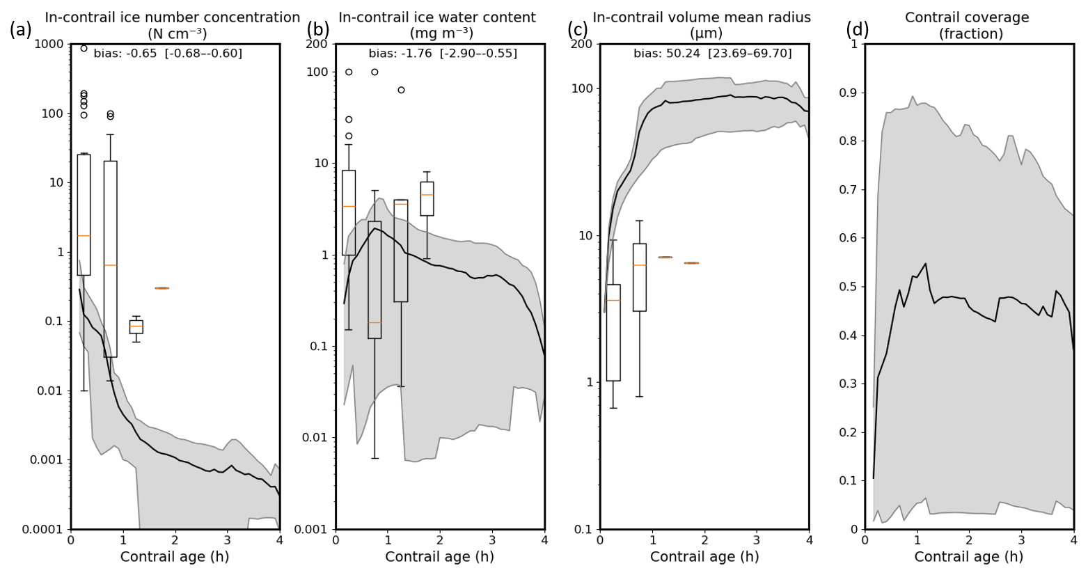 Figure 4Time evolution of contrail (a) ice crystal number concentration in N cm−3, (b) ice water content in mg m−3, (c) mean volume radius in µm, and (d) coverage over 4 h. The Box-and-whisker plots represent observations from COLI at different time points. The black lines represent CASIM-UM model simulation results averaged over all contrails. The shaded areas depict the lower and upper bounds. Observations of contrail age younger than 5 min are excluded. Biases between model simulations and observations are shown in each panel.