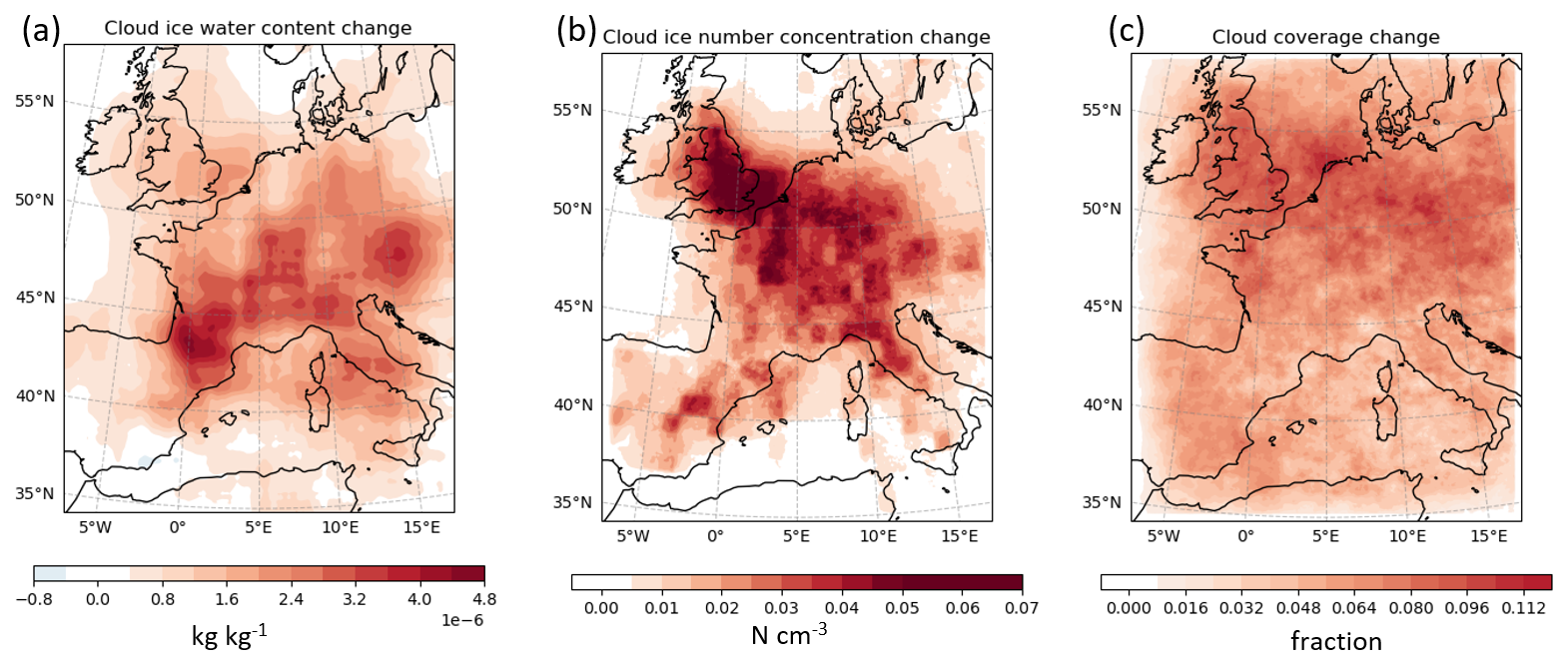 We also perform regional simulations with the AEDT air traffic inventory covering the entire domain (35–58° N and 10° W–22° E). There are widespread increases in ice cloud cover, ice number concentration, and ice water content induced by the presence of air traffic in the European regional simulations with parameterised contrails (Fig. 6), compared to simulations without parameterised contrails. The spatial distribution of these increases aligns with air traffic volume (Fig. 1), with peak values concentrated in regions of dense air traffic. Note that unlike the contrail cluster experiment conducted under clear-sky conditions, these long-term regional simulations also include feedbacks from the ambient atmosphere and natural clouds.