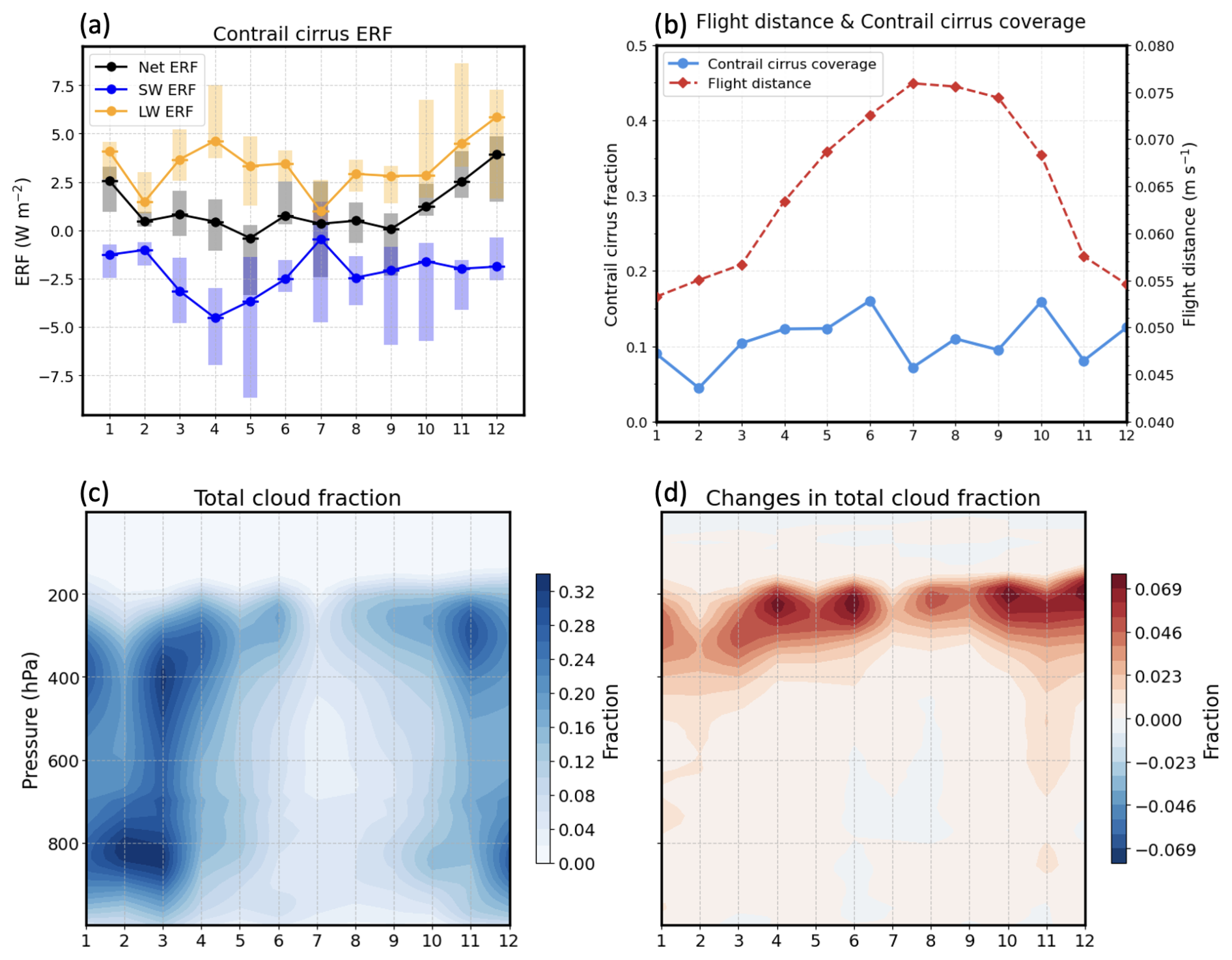 Figure 9Annual cycles of contrail cirrus median net, shortwave, and longwave ERFs (with 10 %–90 % ranges of daily values) (a), contrail cirrus coverage and air traffic distance flown (b), vertical distribution of area-averaged total cloud fraction in the simulations without aviation (c), and vertical distribution of area-averaged contrail-induced changes in total cloud fraction (d).
