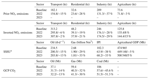 Table 1Comparison for the relative changes in 2022 and 2023 between the inverted NOx emissions and the prior emissions, the GCP CO2 emissions and the statistics from State Statistics Service of Ukraine (SSSU).