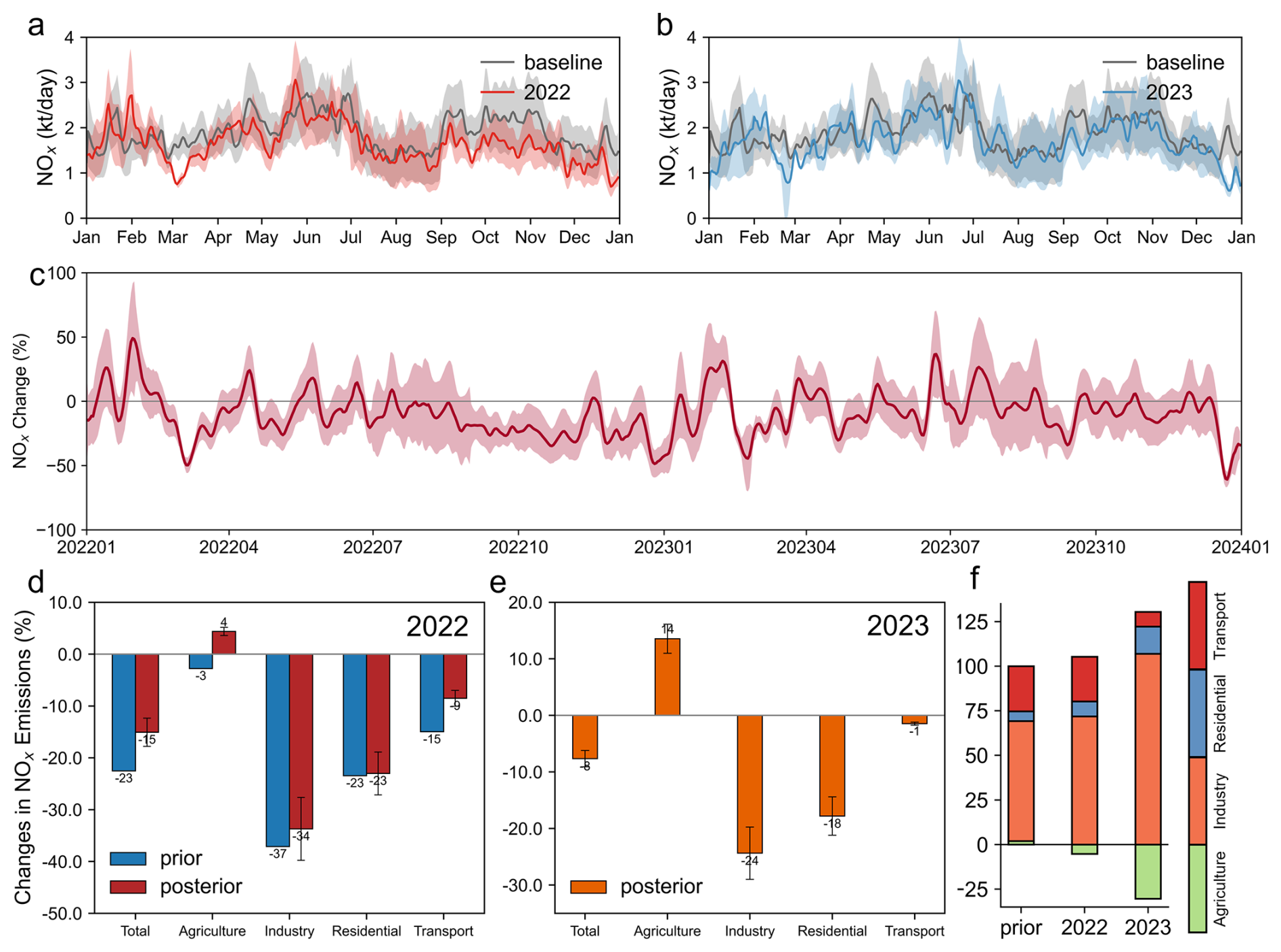 Figure 2Changes in anthropogenic NOx emissions in Ukraine during 2022 and 2023 and their deviations from the baseline period. (a) Daily anthropogenic NOx emissions in 2022 (red) and the baseline period (black). (b) Daily anthropogenic NOx emissions in 2023 (blue) and the baseline period (blue). (c) Relative differences in daily emissions in 2022 and 2023 compared to the corresponding days in the baseline period. (d) Sectoral contributions of prior (blue) and posterior (red) emissions in 2022 relative to the baseline. (e) Sectoral contributions of posterior emissions in 2023 (orange) relative to the baseline. (f) Contribution of each sector to the total reduction in emissions in 2022 (prior and posterior) and 2023, compared with the baseline year.