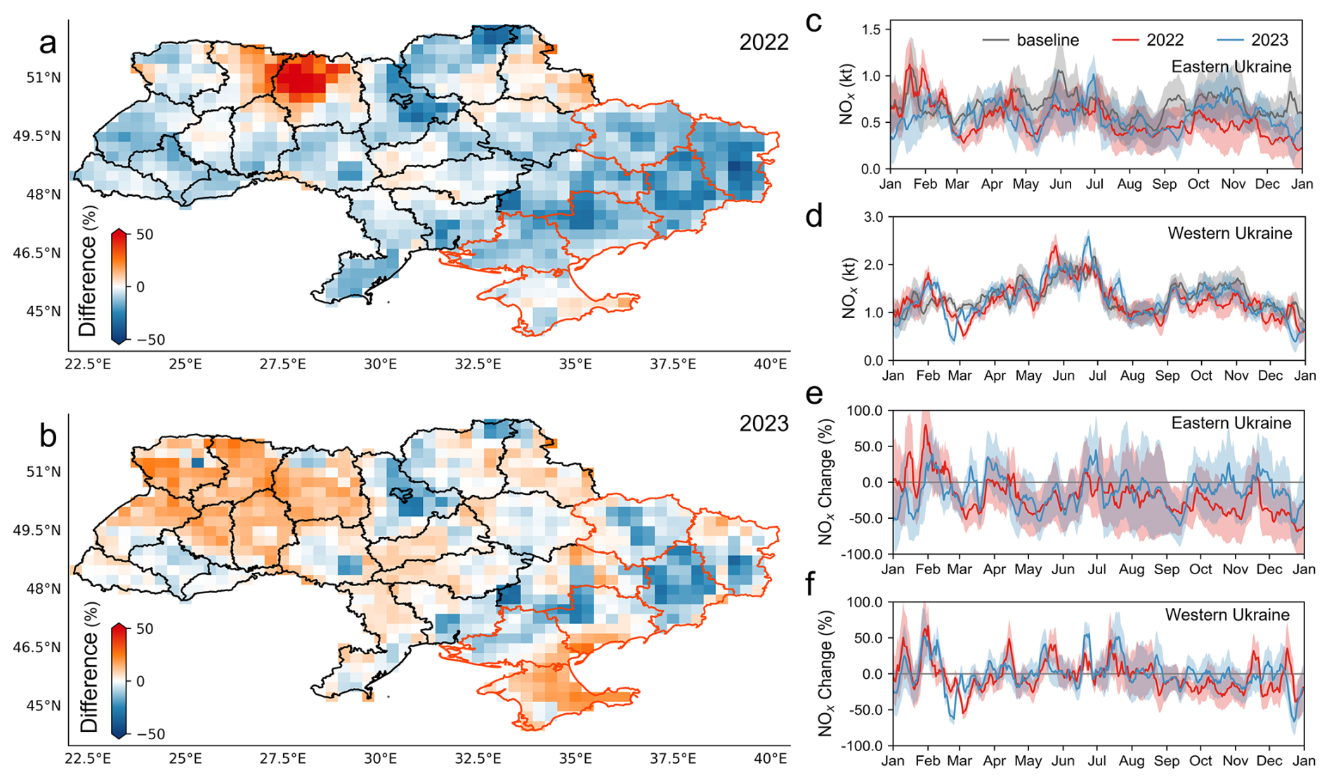 In this study, we quantified relative changes in TROPOMI NO2 VCDs between the wartime period in 2022 and full year of 2023 and the corresponding periods in pre-war baseline (mean of 2019 and 2021; excluding 2020 due to COVID-19 anomalies, same thereafter) (Fig. 1). Results demonstrate that satellite NO2 VCDs effectively capture spatiotemporal variability of air pollution during the war, though their representation of ground-level emissions remains limited given their tropospheric column nature.