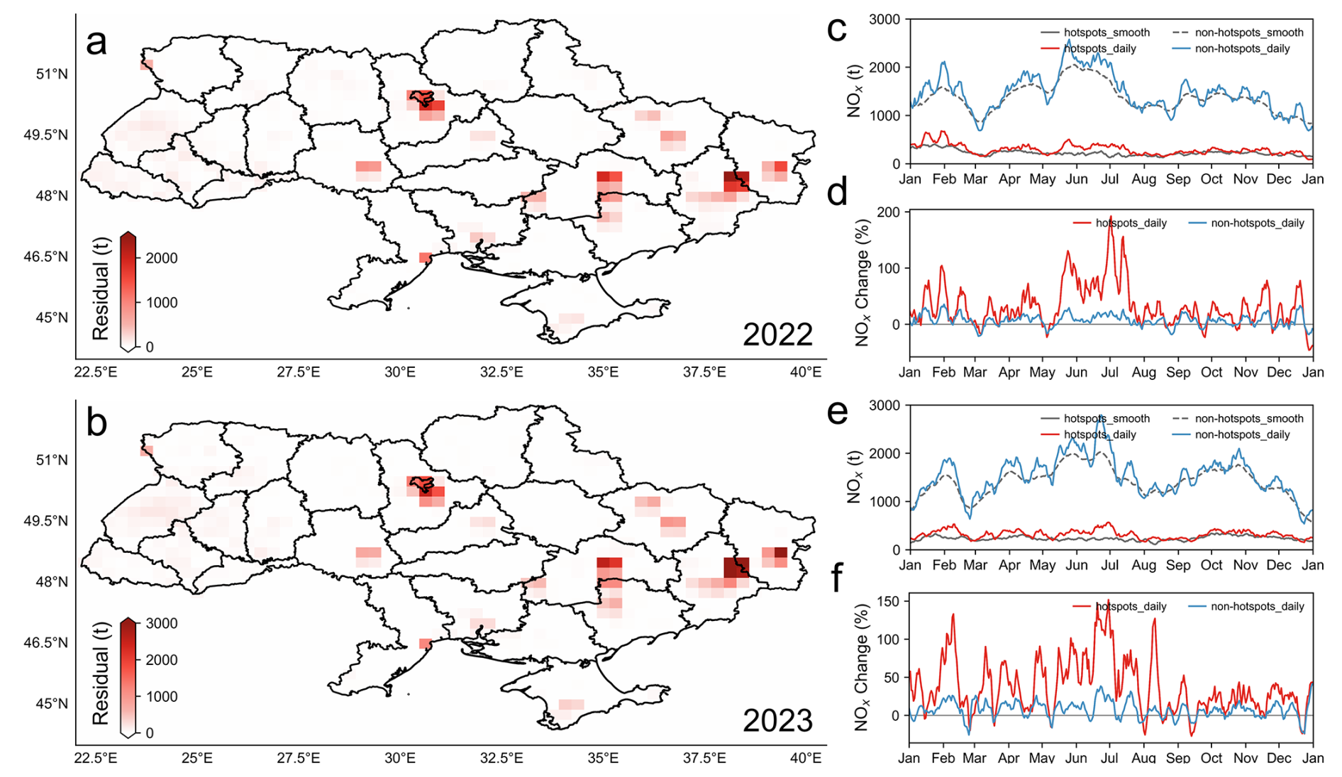 As mentioned above, war itself may also lead to large amounts of NOx emissions, including military vehicles and artillery. Thus, we further discuss the war-related NOx emissions. We firstly applied Locally Estimated Scatterplot Smoothing (LOESS) and residual analysis to quantify the spatial heterogeneity of significant emission anomalies in the 2022 wartime period and 2023 (Fig. 4a, b). Significant emission anomalies were identified by calculating the cumulative significant residuals (exceeded three times the standard deviation) of daily grid-level emissions relative to the corresponding 30 d LOESS-smoothed values. The results indicate localized positive residual anomalies (red hotspots) were observed along conflict frontlines and logistical hubs, suggesting that military operations and emergency responses significantly elevated emissions in these areas. This is consistent with the severely damaged areas identified by Gupta and Shukla (2024) using NASA MODIS Fire Information for Resource Management System active fire detections. We retrieved daily anthropogenic NOx emissions alongside verified reports of military activity in Ukraine (2022–2023) from Figs. 2a–c, S3, and S4, Broadcasting Corporation (BBC, 2025) and Reuters (2025), and found strong correspondences between emission anomalies and key military events. In Kyiv and Kharkiv, emissions sharply declined following the outbreak of war on 24 February 2022, reaching minima during periods of civilian shutdown. Emissions rebounded during March as military logistics and emergency operations intensified. Kharkiv and Luhansk showed short-term positive anomalies during Ukrainian counteroffensives and Russian reinforcements, while Donetsk experienced sustained negative anomalies due to prolonged conflict and infrastructure damage. Crimea, as a logistical hub, showed persistent emission increases linked to military operations. These findings highlight the potential of high-frequency NOx emissions as a proxy for monitoring the intensity and evolution of wartime activities.