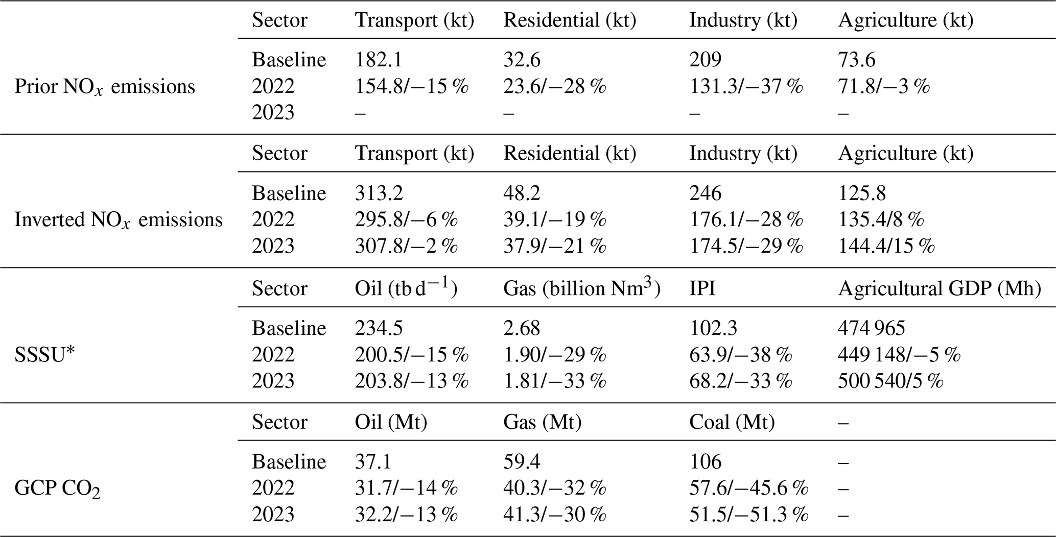 Table 1Comparison for the relative changes in 2022 and 2023 between the inverted NOx emissions and the prior emissions, the GCP CO2 emissions and the statistics from State Statistics Service of Ukraine (SSSU).