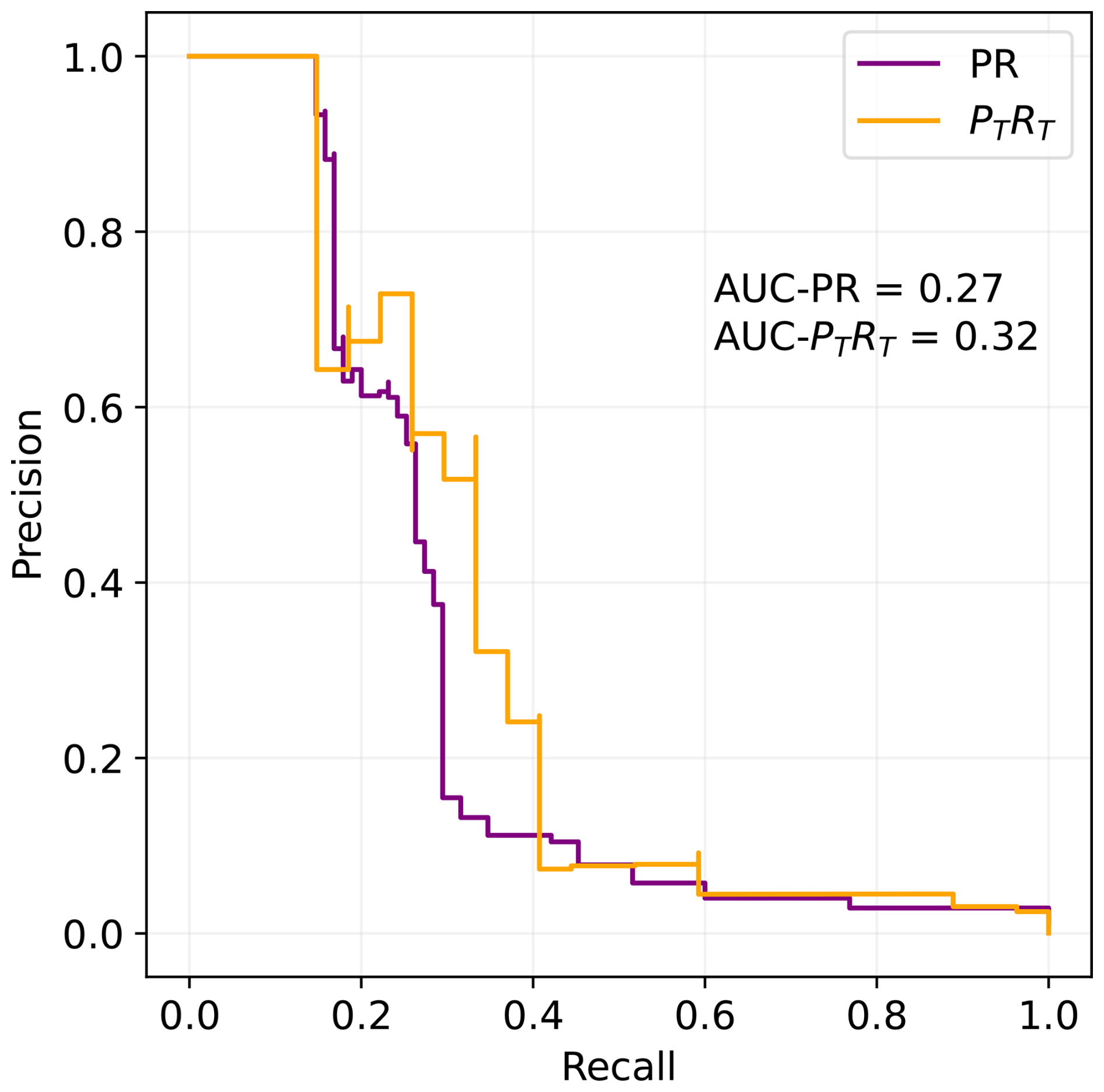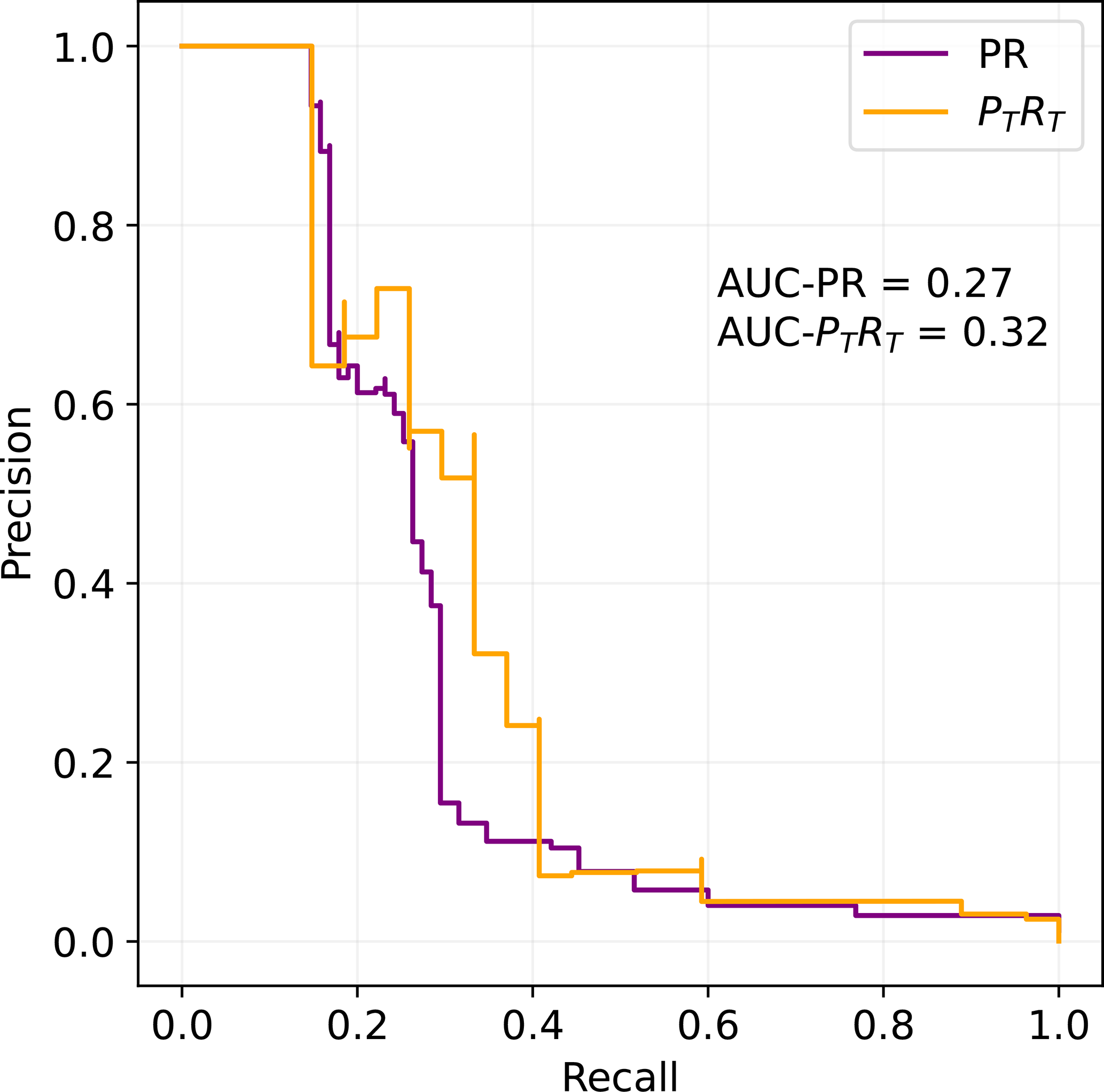 The classic AUC-PR score is particularly suitable to evaluate the detection of individual, isolated outliers. However, outliers in time series often occur as sequences. It is then usually not necessary to detect every single outlier, but it is sufficient to detect at least one outlier per sequence. In order to tackle this issue, Tatbul et al. (2018) have developed range-based Recall (RT) and Precision (PT) that are generally more suitable to validate outlier detection in time series.