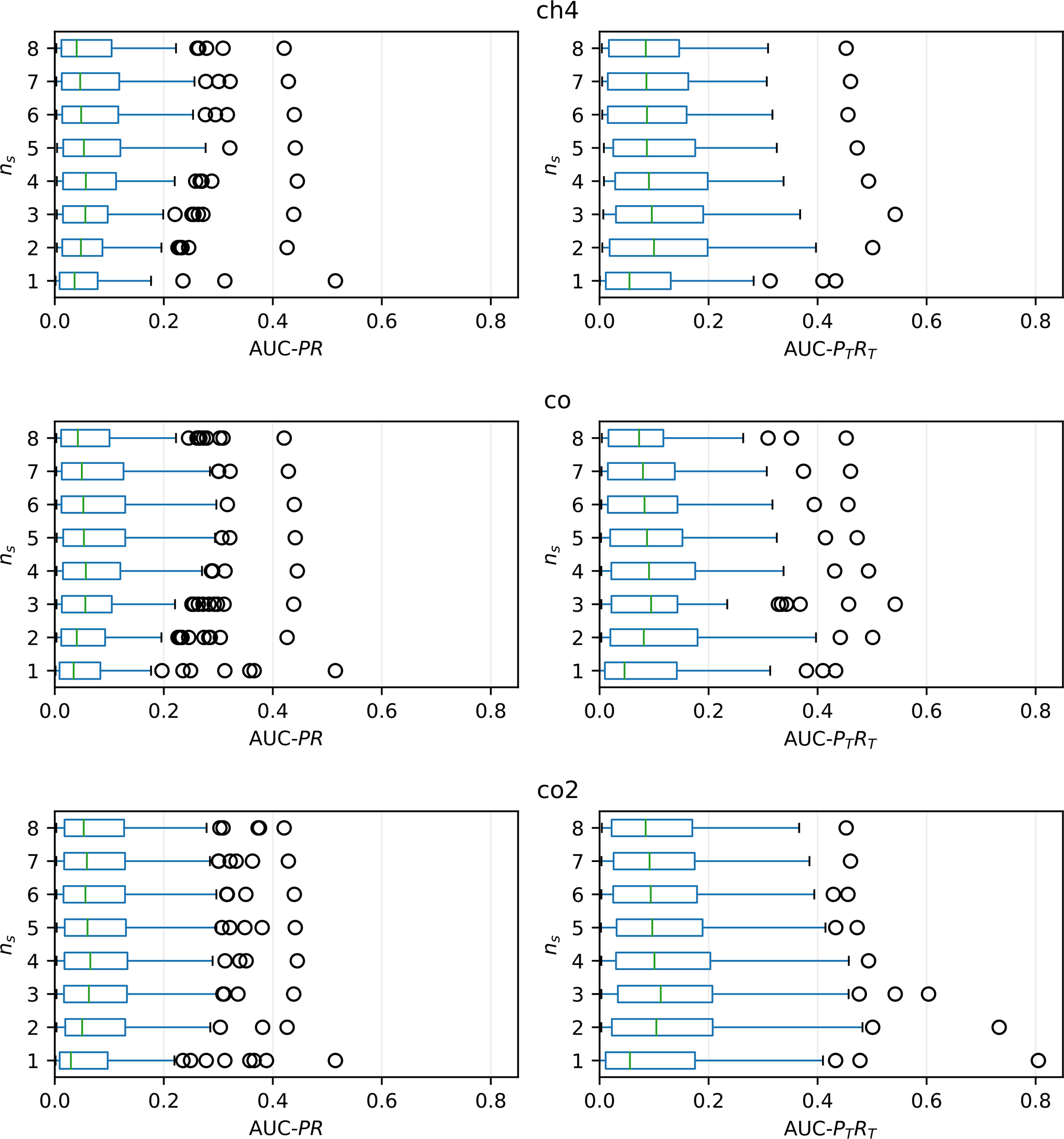 Figure 3 shows the distributions of the AUC-PR and AUC-PTRT scores for different values of ns (with k=100) for CH4, CO and CO2. The choice of the best value for ns depends on which score is considered: somewhat counterintuitively, the AUC-PR score favours a higher ns (i.e., longer sub-sequences) than the AUC-PTRT score. On the other hand, differences between variables are rather small, although CO produces slightly lower scores than the other gases (O3 could not be tested due to lack of suitable data). We also carried out the same validation for the lowest sampling heights, obtaining generally lower scores but with a similar dependency from ns (Fig. S3).