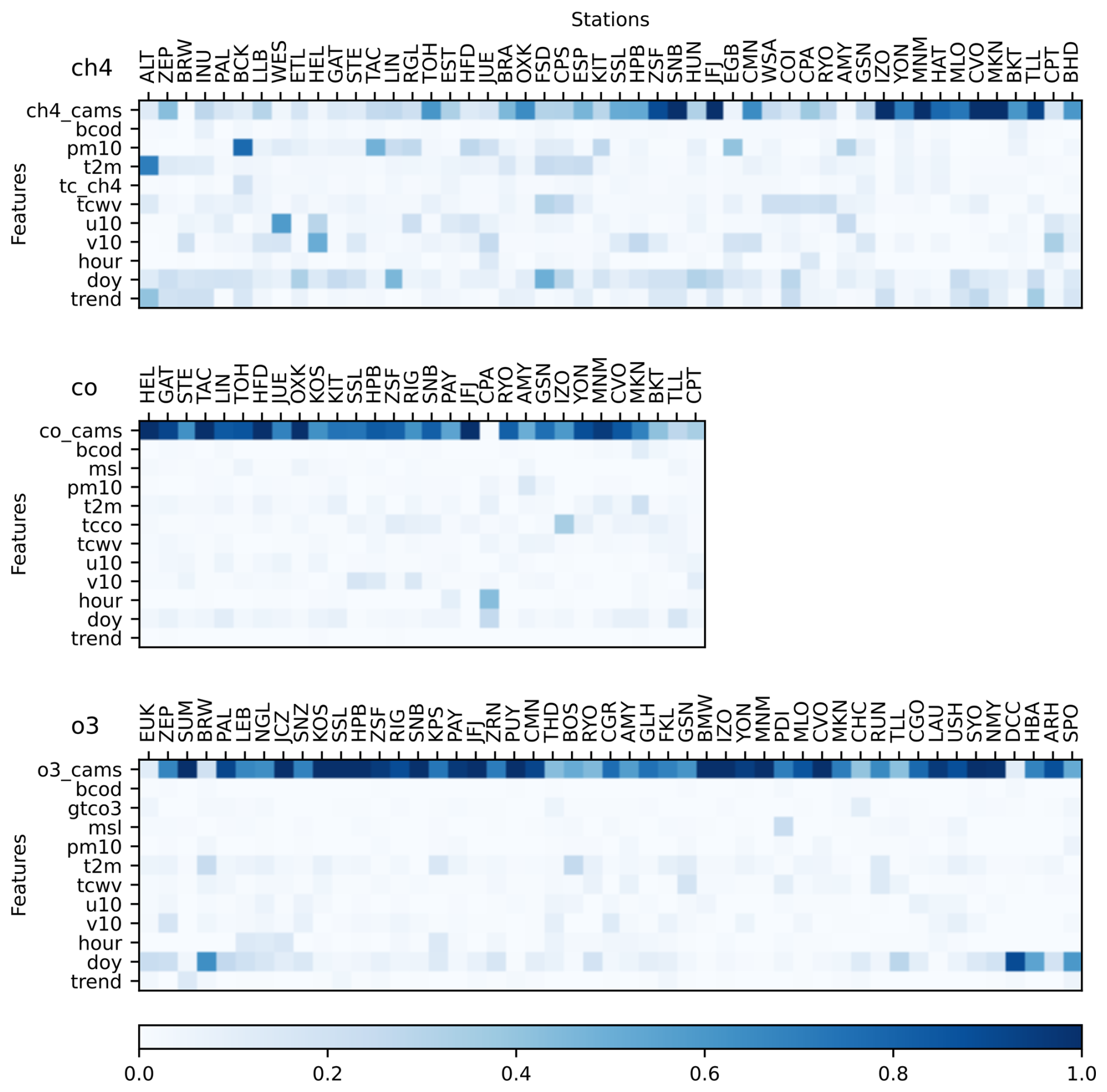 The total column variables are a useful backup when none of the pressure levels that we extract from the CAMS forecasts are close on average to the station's elevation. Examples are Izaña at 2373 m (rather far from both the 850 and the 700 hPa levels) and Chacaltaya at 5340 m (well above the 600 hPa level). These two stations show the largest importance for the total column of CO and O3, respectively. Moreover, the total column of correlated variables like water vapour and black carbon are useful proxies for precipitation and pollution, which have important direct and indirect effects on the concentration of many trace gases.