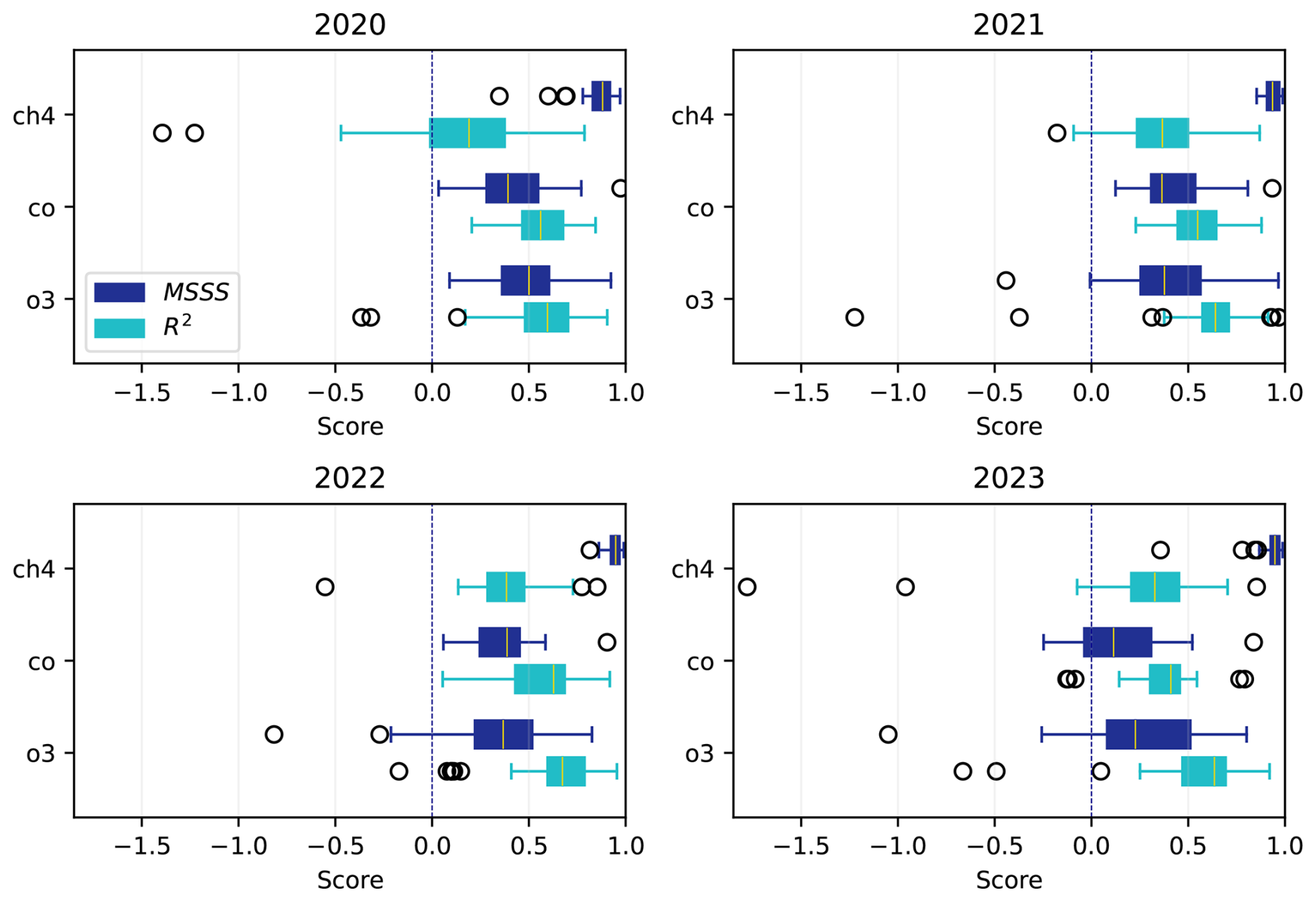 The variable that scores best is O3, in part because it exhibits larger and more predictable diurnal and seasonal cycles than CO. Moreover, the large outliers that can affect CO are especially detrimental when evaluating scores that rely on the MSE, as the case of 2023 also shows.