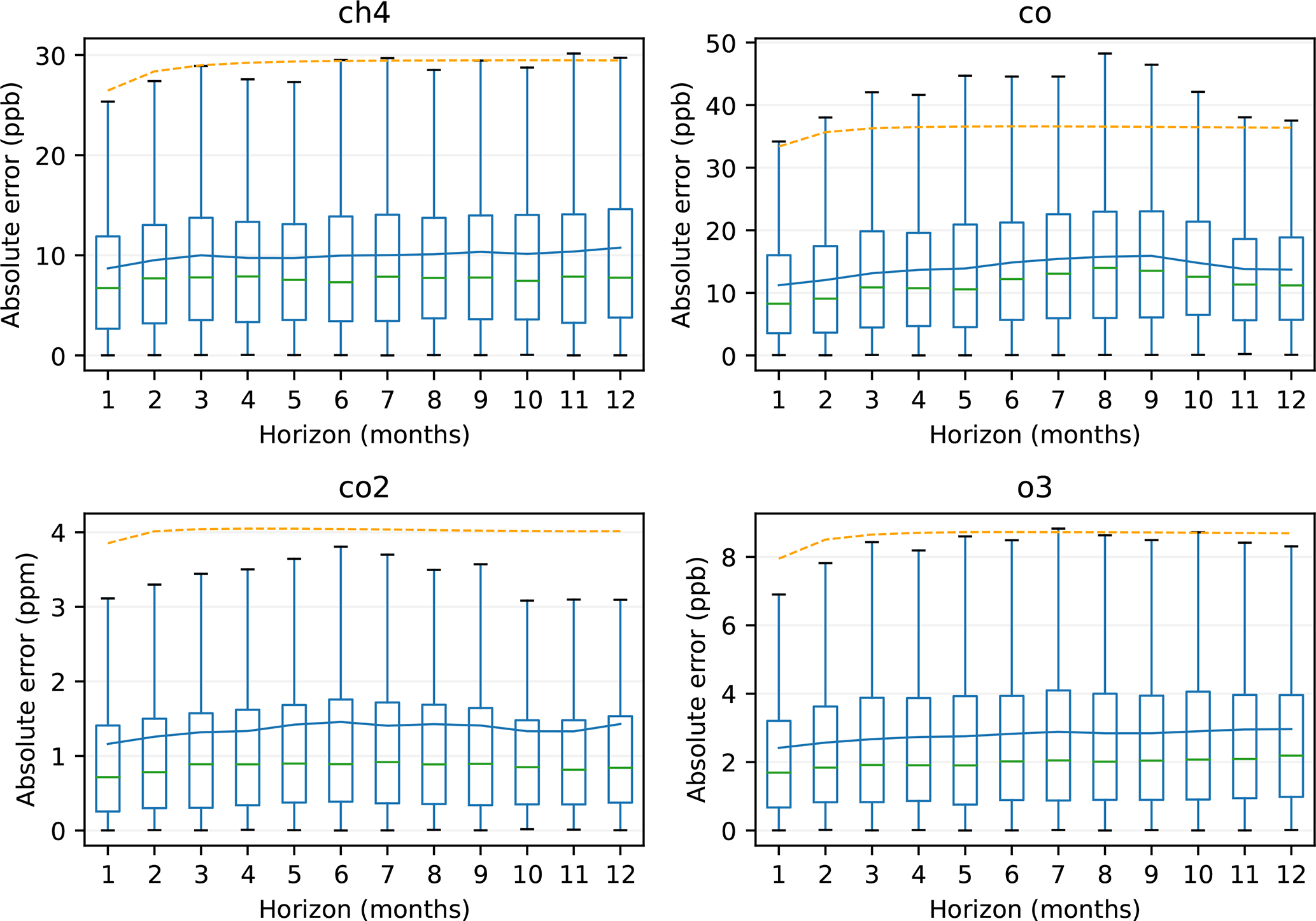 As one would expect, the performance is best for a 1 month horizon and the absolute error increases with time. However, for CO and CO2, the absolute error reaches a maximum after 6–8 months and then decreases again slightly. The likely explanation for this behaviour is that the inter-annual variability of these gases has itself a large seasonal cycle, particularly at mid-latitudes (higher in winter for CO, in summer for CO2). Therefore, a prediction starting from a season with low variability will tend to perform better on a 12 month than on a 6 month horizon, while a prediction starting from a season with high variability has high chances of performing poorly for all horizons.