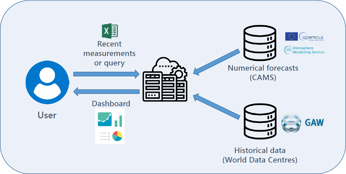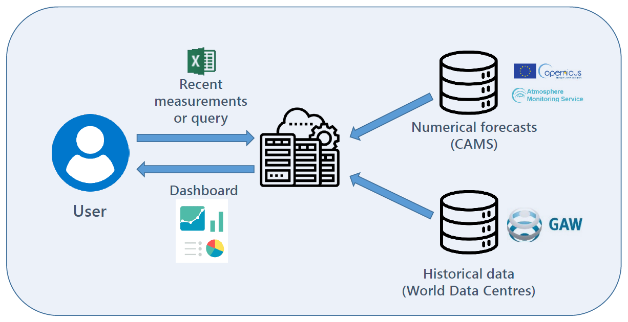 Figure 7 gives a simple schematic of the data flow. GAW-QC is synchronized daily with the archive of the CAMS forecasts, from which the relevant variables and grid points are extracted. Synchronization with the GAW world data centres occurs at irregular intervals, although an extension to an automatic loading process is technically feasible provided the data are available through appropriate APIs.
