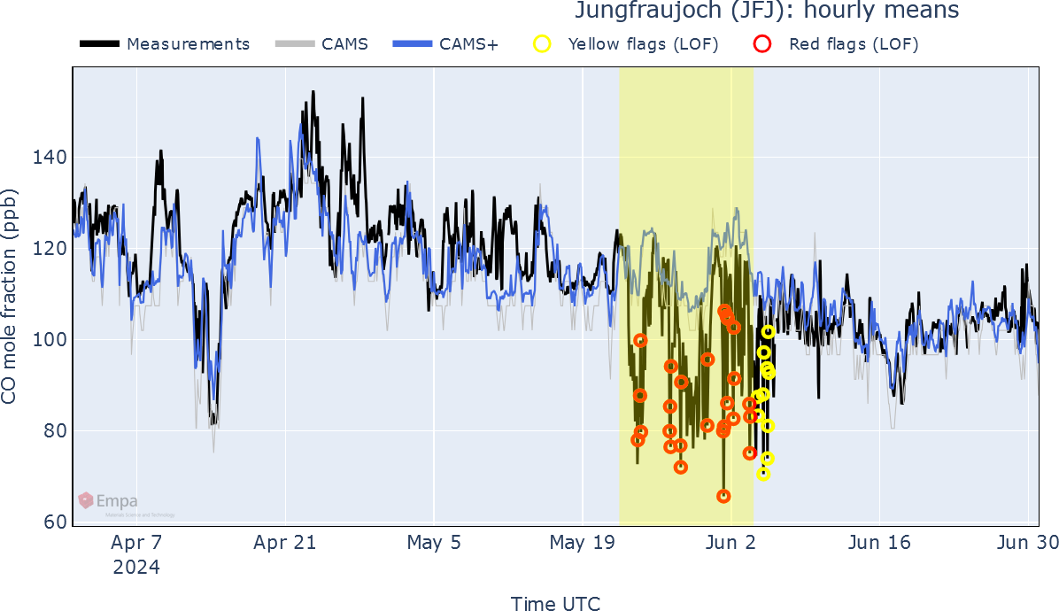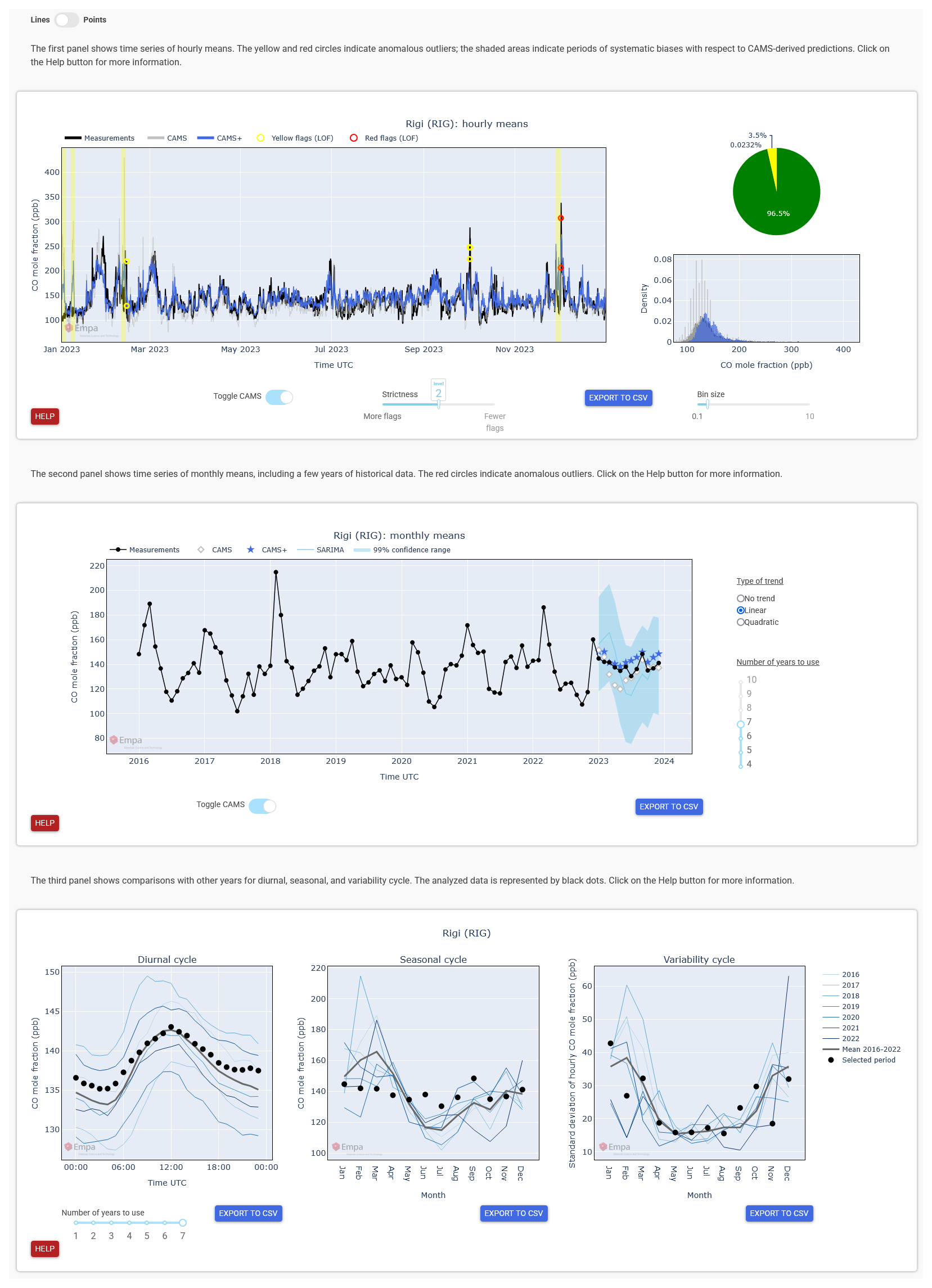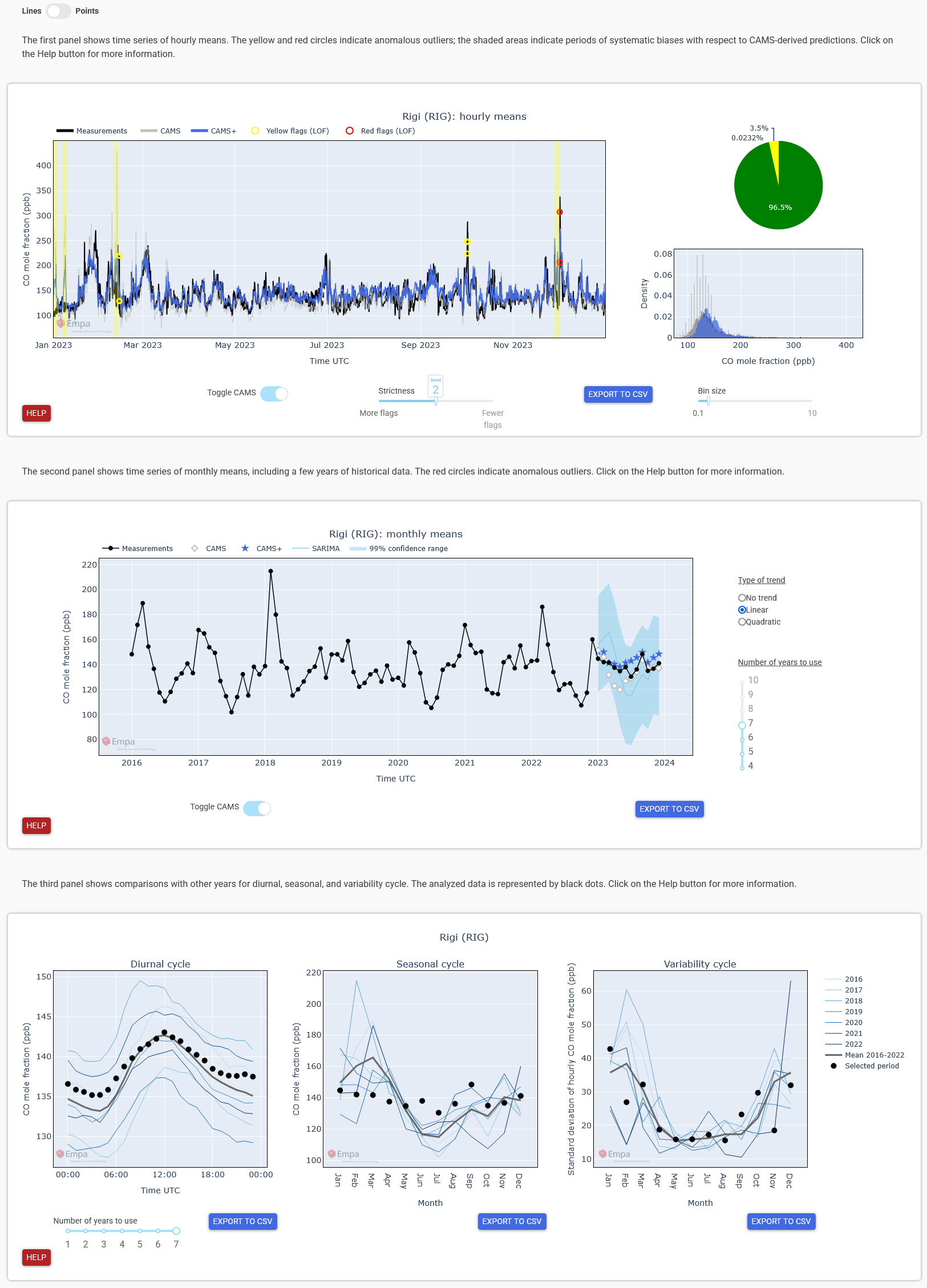Note that, to improve readability, periods with significant differences between measurements and CAMS+ that are less than 50 h apart are merged together into a single shaded area on the plot (but not in the export file). Given the relatively large inter-annual variability of CO and the short duration of the event, this issue is not clearly visible on the other panels of the dashboard.