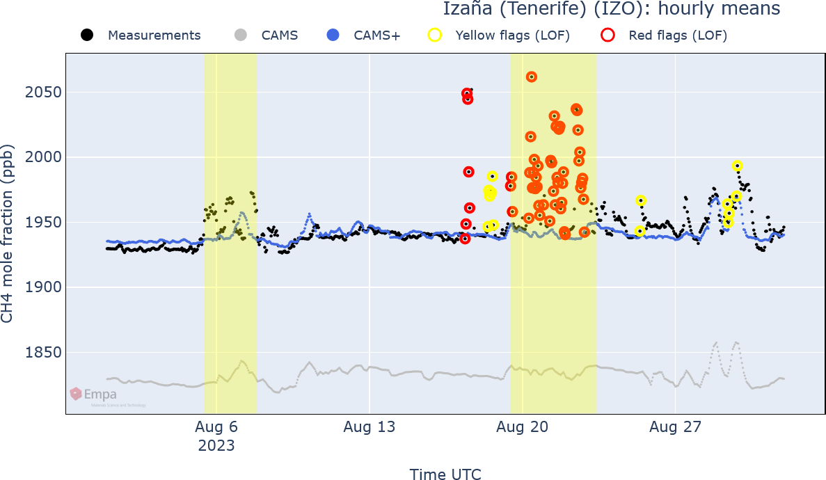 Figure 10Hourly plot produced by GAW-QC for validated CH4 data measured at the station of Izaña in August 2023. Here dots have been used instead of lines to better highlight outliers.