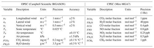 Table 1Variables and descriptions measured from the open-path (Campbell Scientific IRGASON) and closed-path (MIRO MGA7) EC systems. Precision and accuracy figures are as per manufacturer user manuals.