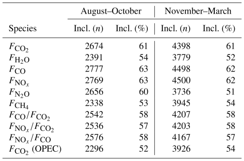 The study period of 1 August 2022 to 31 March 2023 contains 11 663 half-hour flux averaging periods. The distribution of data quality is summarised in Table 2. Retention for the MGA7 species over both warm and cool months ranges from 52 % (N2O and H2O) to 61 % (CO2, CO, NO2). This is similar to the average retention value found in other urban EC studies (Matthews and Schume, 2022, Table 1), though the wide range of different quality control regimes creates a large spread in retention rates. A large number of filtered periods are instrument downtime, both planned and unplanned, and reduce the data retention by 7 %–8 %. The wind direction filter subsequently removed 253 periods (2.2 %). The u* filter removed a significant number of periods: between 7 % and 10 % depending on the species. Data retention is fairly comparable between seasons, differing by only a few percent. One exception is , for which technical problems resulted in multiple weeks of lost measurements during November-March.