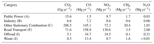 Table 3Emissions inventory overview for a 4 × 4 km2 box centred on the measurement tower. Categories given with their GNFR letter. Minor categories have been omitted.