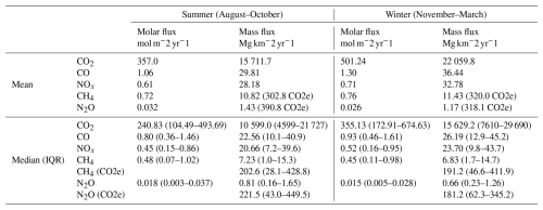 Table 6Summary of species fluxes. Results are split by season (August–October and November–March) and given for the median day (based on hourly medians) and mean day (based on hourly means). Results are presented as molar fluxes in mol m−2 yr−1 and mass fluxes in Mg km−2 yr−1. For mass fluxes of CH4 and N2O the CO2 equivalent (CO2e) mass flux is also given using 100-year global warming potential factors of 28 (CH4) and 273 (N2O) (Forster et al., 2021).