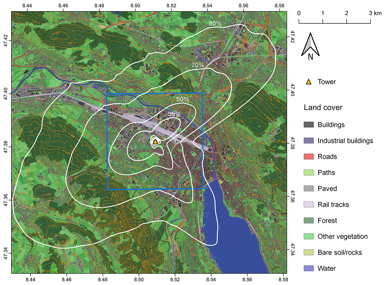 Figure 1Location of measurement site (yellow triangle) over a land cover map of Zurich (Amtliche Vermessung, 2024). Isolines up to the 80 % footprint climatology according to Kljun et al. (2015) are overlaid in white. Note that the footprint is modelled after all quality control filtering and represents only the measurement periods retained for analysis. The blue box centred on the tower shows the 4 × 4 km2 box centred on the tower from which reference inventory molar emission ratios are determined (Sect. 2.4) and covers 67 % of the study period's footprint.