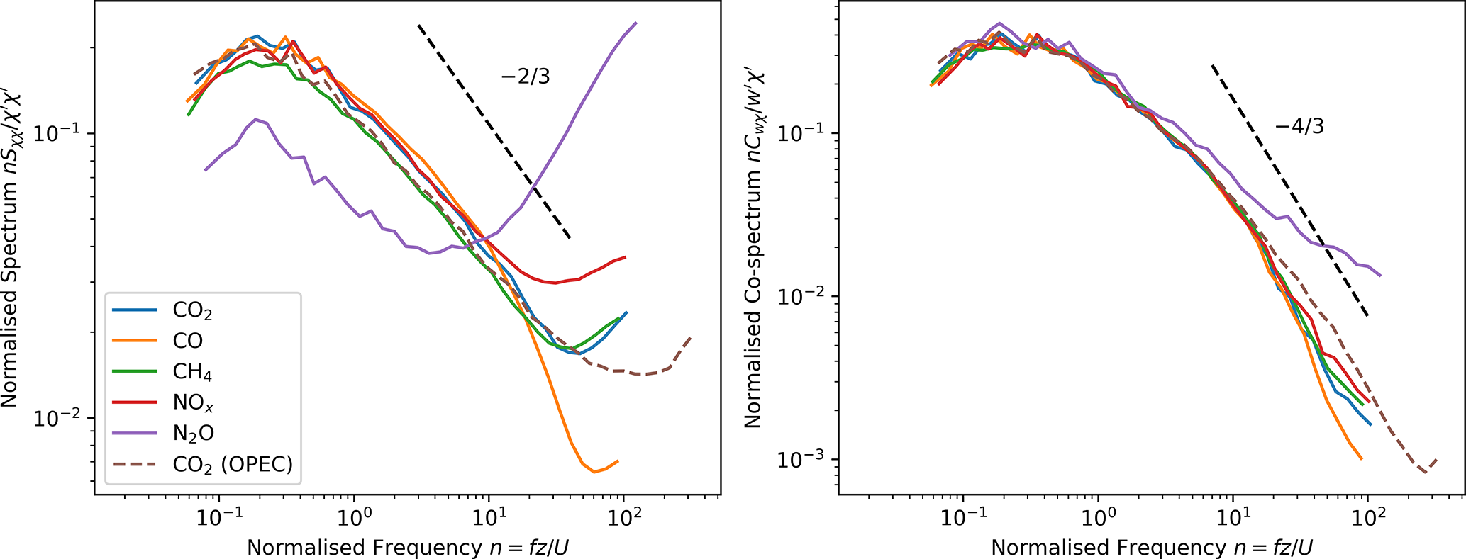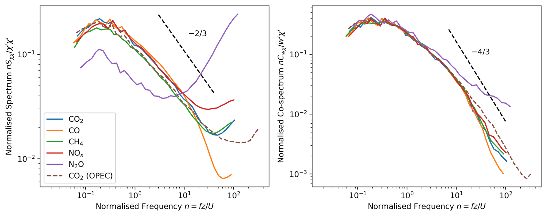 Figure 2Normalised spectra and co-spectra for each species measured by the CPEC as well as the CO2 from the OPEC. The (co-)spectra are plotted against the normalised frequency. Theoretical slopes according to Kaimal et al. (1972) are plotted as dashed black lines.