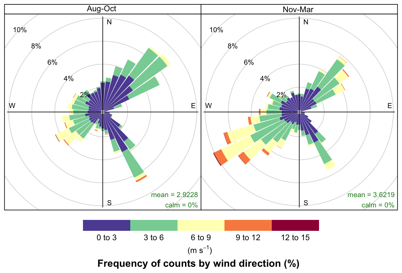 Figure 3Wind regime for half-hour periods during the observation period which pass the CO2 quality control tests.
