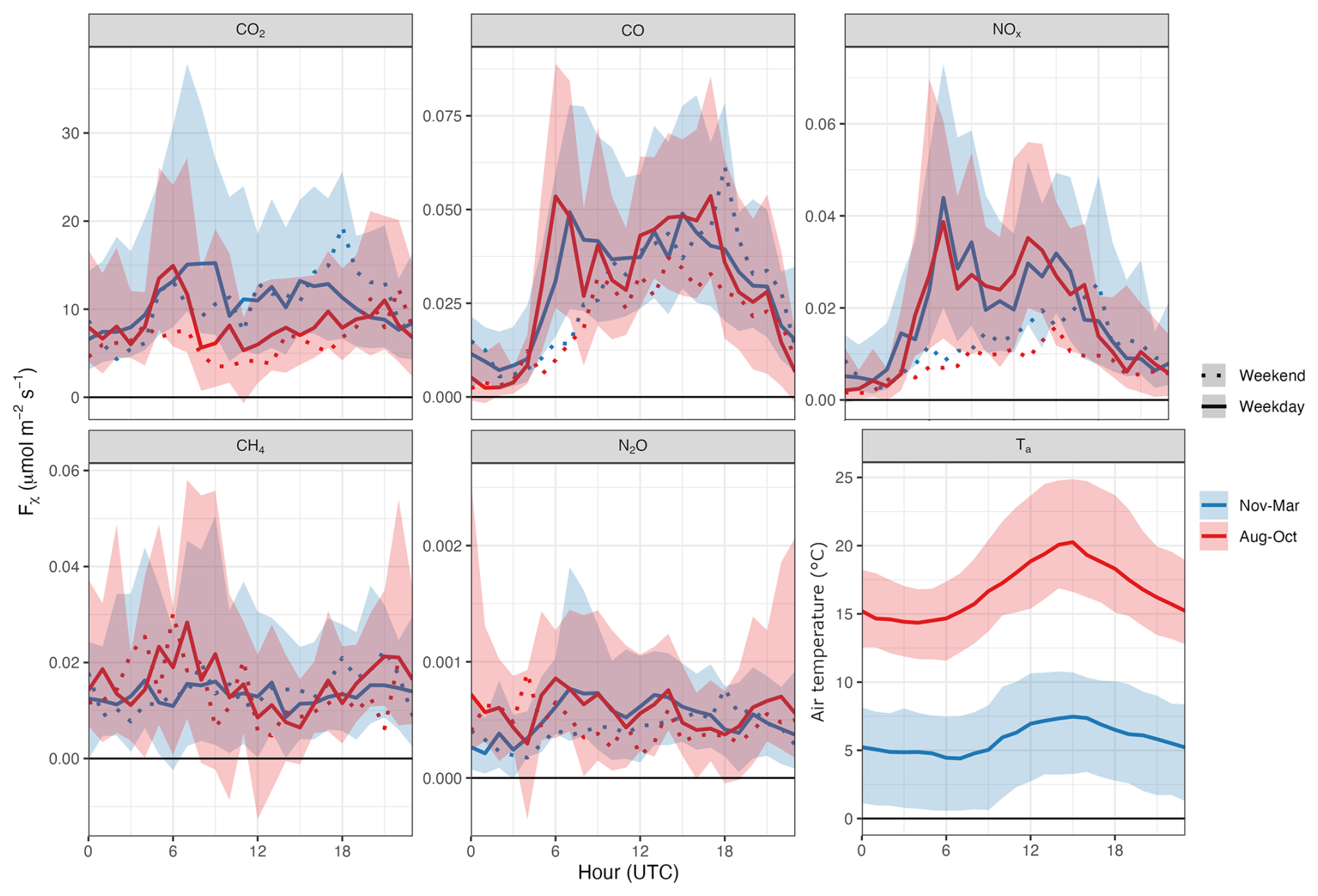 Figure 4Diurnal and seasonal pattern of fluxes of CO2, CO, NOx, CH4 and N2O measured by the CPEC. Weekdays (Monday to Friday) are shown as solid lines while weekends and holidays (Saturday, Sunday, and local holidays) are shown as dotted lines. The lines indicate the hourly medians and the shaded band the inter-quartile (P25 to P75) range. Note that the inter-quartile range is only shown for weekdays. Fluxes are divided by season, where red is August to October 2022 (inclusive) and blue is November 2022 to March 2023 (inclusive). In the sixth panel, air temperature (Ta) as measured at the tower is shown.