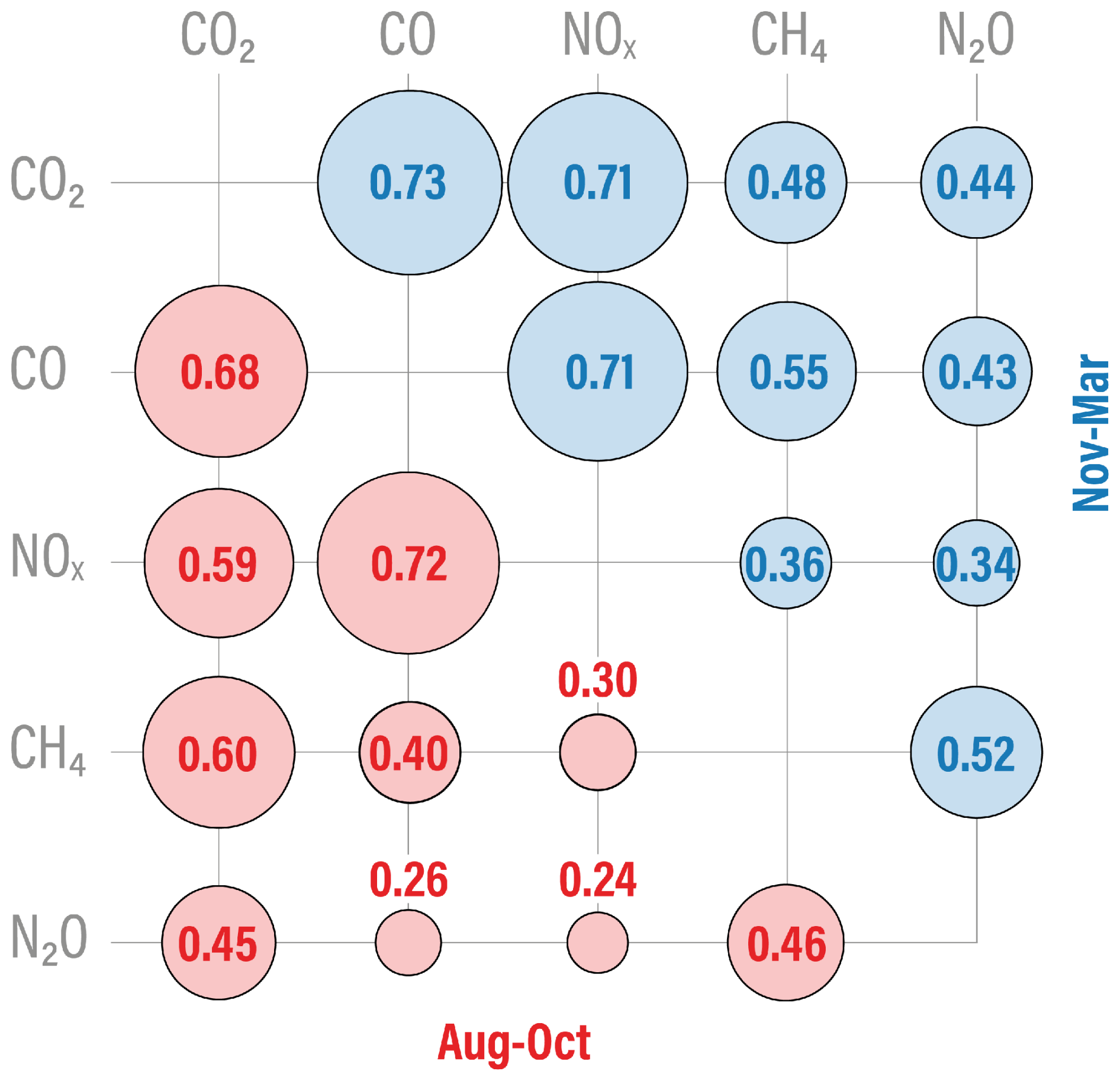 The correlation (Pearson's correlation coefficient r) between the fluxes of all species pairs on a 30 min scale is shown in Fig. 5. In the summer months (red, lower left) the highest correlation is seen between and FCO at 0.72. Correlations at or above 0.6 were also observed between and FCO, as well as between and . The lowest correlations (≤ 0.3) were observed between and FCO, and , as well as and . In the winter months (blue, upper right), correlations between nearly all species pairs increase, with the exception of and which decreases from 0.60 to 0.48. Correlations between FCO and as well as and remain essentially unchanged (0.01 difference between seasons). Co-emitted species CO and NOx are selected as tracers for ffCO2 in the following sections on the basis of their larger median fluxes and strong correlations in the winter.