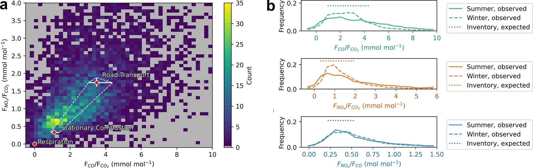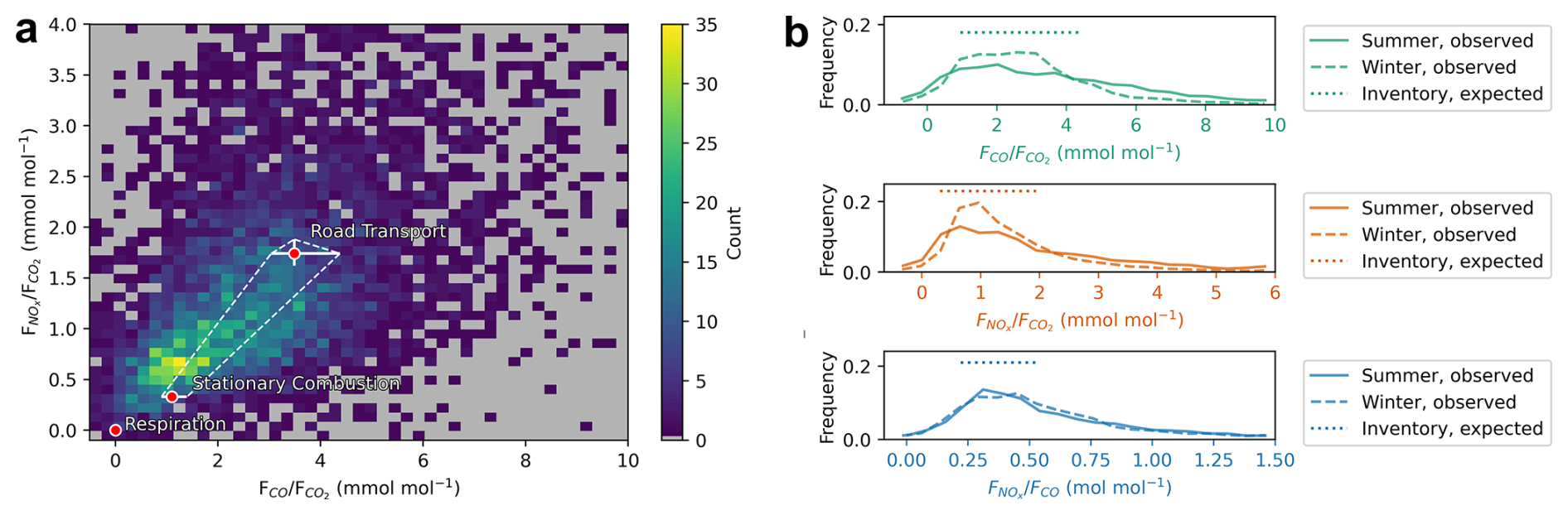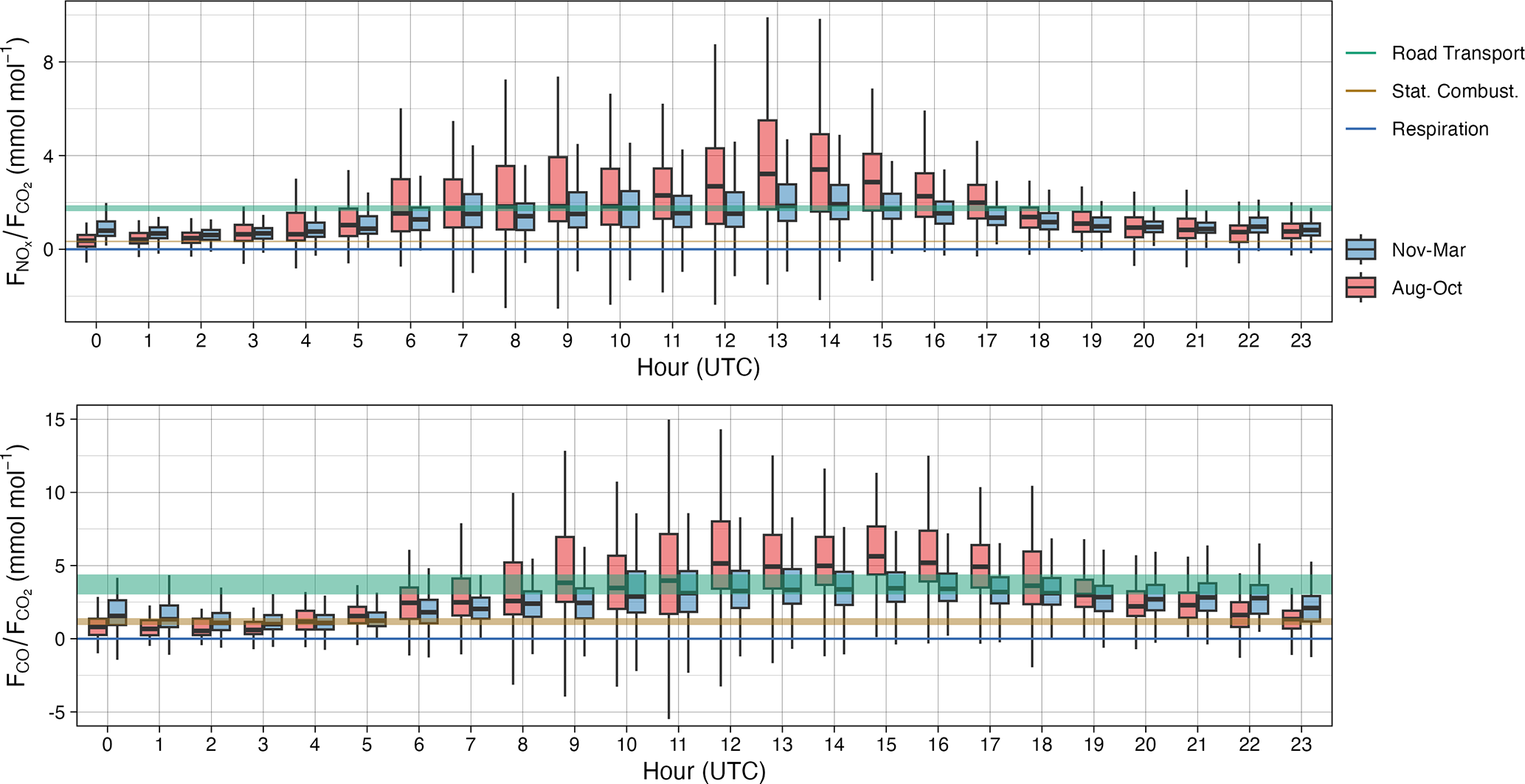 Observed flux ratios of the three most-emitted species (CO2, CO, and NOx) were calculated and compared to characteristic spatially-averaged values from a city emission inventory within a 4 × 4 km2 area centred on the measurement tower. Ratios of and in winter were generally well characterised by the stationary combustion and road transport categories of the emission inventory. Significant and systematic exceedance of the inventory ratios was observed in the summer afternoon hours, which was attributed to decreased net due to photosynthetic uptake. Measured ratios of were less well characterised by the inventory, with significant exceedance of the expected ratios coming from the NE. Nevertheless road traffic peaks seem well characterised by the measured ratios. No statistically significant seasonal difference was observed in ratios. Note that a significant bias correction was applied to raw measurements of NOx (see Sect. 2.3). This correction introduces a significant but unquantified uncertainty to individual flux measurement periods.