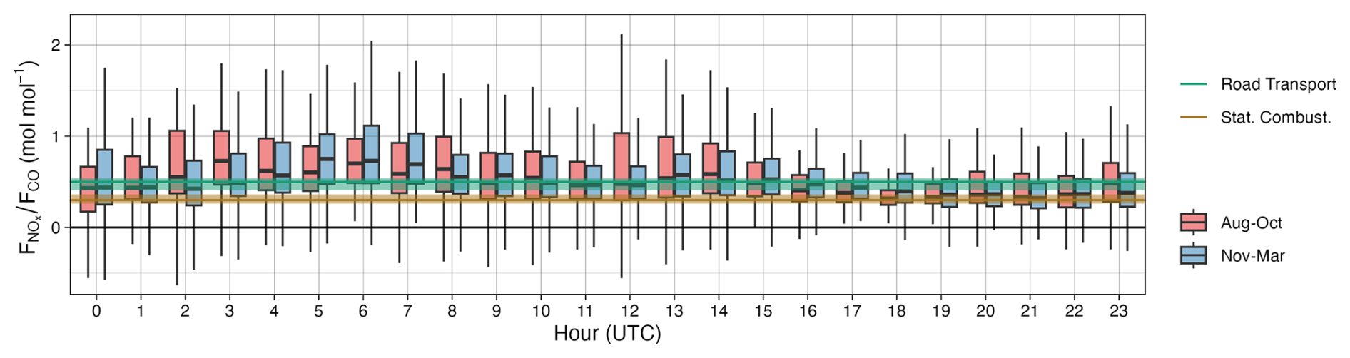 Similar patterns are observed in the bottom panel of Fig. 6 for the ratios. Nocturnal ratios in the summer from 22:00 to 04:00 UTC agree well with the inventory stationary combustion ratio, on average < 0.3 mmol mol−1 from the median expected value. In contrast to the ratios, the remain elevated well above this ratio from 18 to 21 in both seasons and in the winter remain outside the expected range for stationary combustion through 23:00 UTC. Median nocturnal ratios in the winter are 35 % greater than the summer (1.9 to 1.4 mmol mol−1). During the winter daytime, a similar increase towards the expected road transport ratios is observed and the median flux ratio falls within this range from 12:00 to 18:00 UTC, with a mixture between the two source categories during other hours. Again in the summer there is a systematic exceedance of the upper road transport ratios during the afternoon. From 12:00 to 17:00 UTC, the median ratio is 0.7 to 1.8 mmol mol−1 greater than the upper road transport reference ratio, and the median summer daytime ratio is 42 % greater (4.4 to 3.1 mmol mol−1) than the winter. Again, the observed median hourly in the winter are well bounded by the expected values determined from the emissions inventory whereas a systematic exceedance in the summer afternoon suggests biospheric influence.
