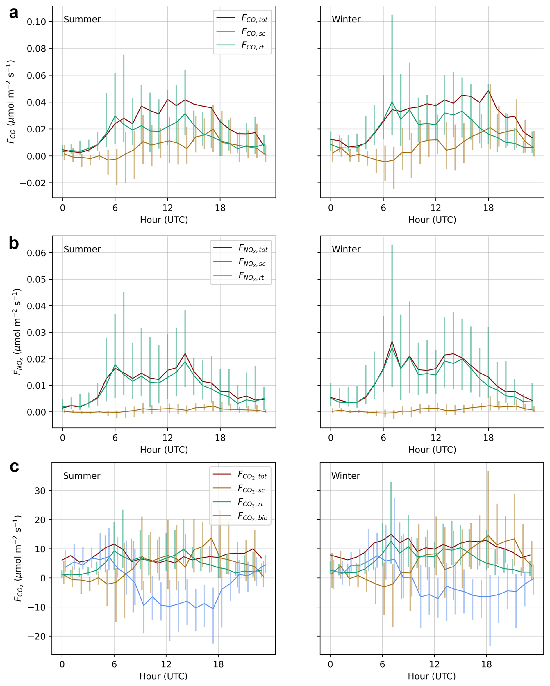 The linear mixing model described in Sect. 2.5 was applied and the decomposed fluxes of CO, NOx, and CO2 are shown in Fig. 9. Model input parameters for a and b were chosen from the full 4 × 4 km2 footprint area of Table 4 and were kept constant across times and seasons.