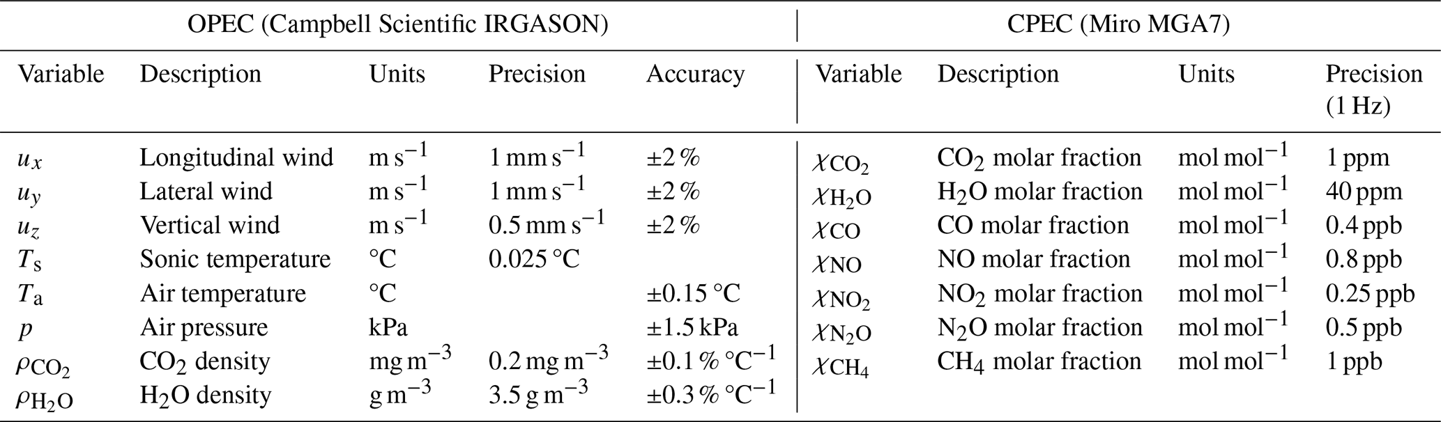 Table 1Variables and descriptions measured from the open-path (Campbell Scientific IRGASON) and closed-path (MIRO MGA7) EC systems. Precision and accuracy figures are as per manufacturer user manuals.