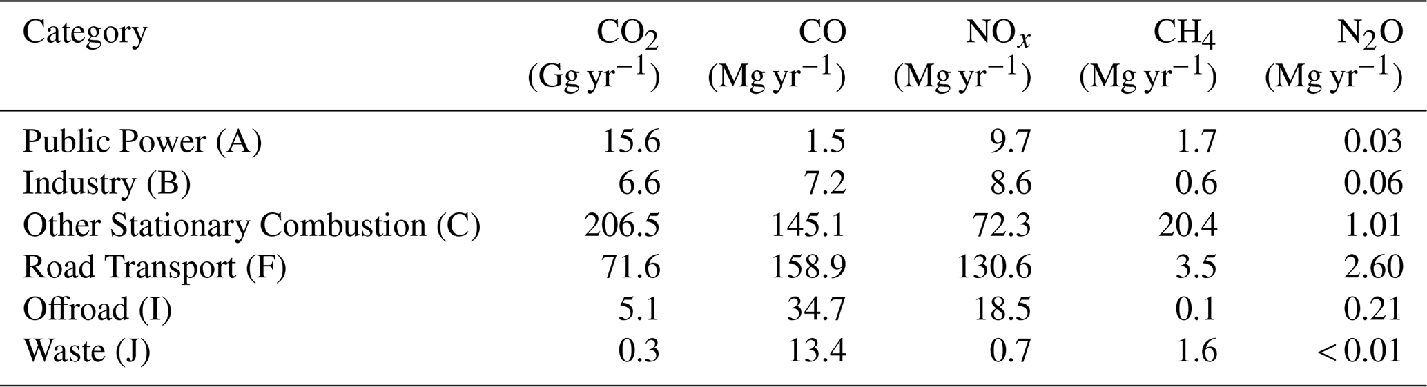 Table 3Emissions inventory overview for a 4 × 4 km2 box centred on the measurement tower. Categories given with their GNFR letter. Minor categories have been omitted.