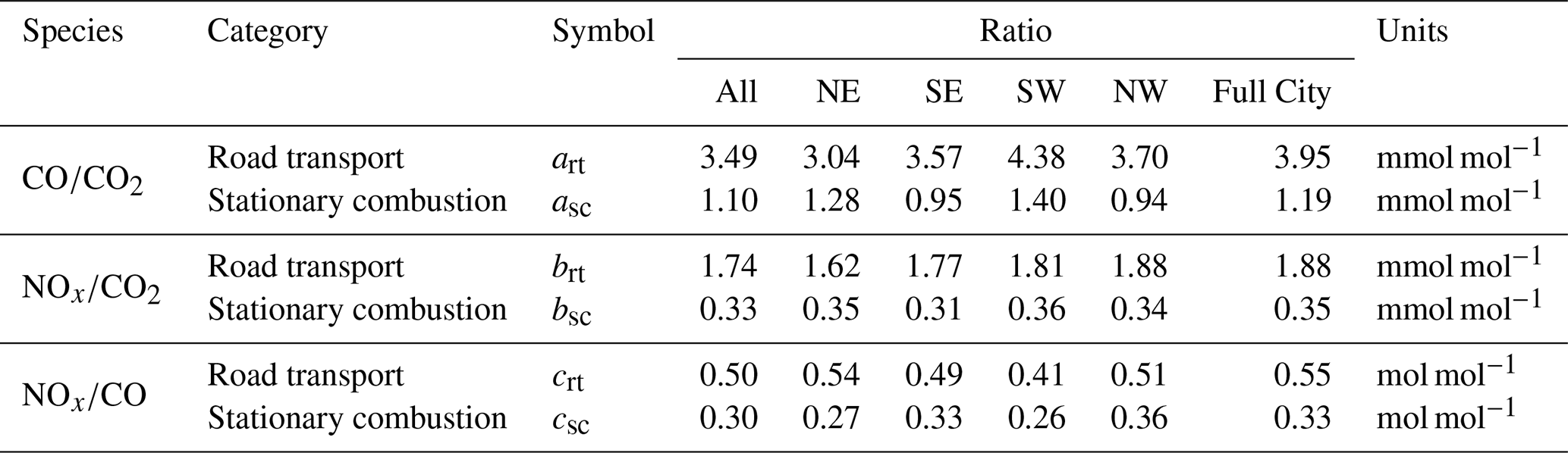 Secondly, depending on the footprint, the contribution from sectors other than road transport and stationary combustion may impact measured ratios. While these two sectors comprise 91 % of CO2 from combustion in the 4 × 4 km−2 area surrounding the tower according to the emission inventory, they comprise 81 % of CO and 84 % of NOx. Some sources that may also contribute to the measured flux fall within the same ratio range. E.g., 7 % of SW FCO may be expected from industry where the expected ratio of 2.48 mmol mol−1 falls between the expected stationary combustion and road transport values. In contrast, 13 % of from the NE is expected from public power, with a characteristic ratio of 3.82 mol mol−1, well outside the ratios of Table 4.