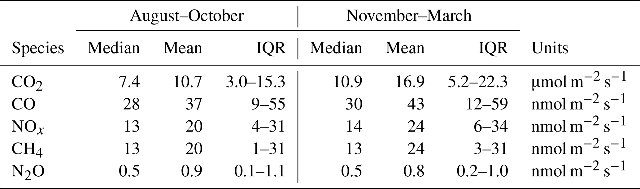 Measured diurnal and seasonal patterns are shown for each species in Fig. 4 and summarised in Table 5. The median 24 h in August–October was 7.4 µmol m−2 s−1 compared to 10.9 µmol m−2 s−1 in November–March with pronounced diurnal variability. for both seasons begins to peak in the morning hours of 05:00–06:00 UTC (07:00–08:00 local time in the summer and 06:00–07:00 LT in the winter). Median nocturnal is similar between seasons, varying by < 0.5 µmol m−2 s−1 between 22:00 and 04:00 UTC. During the day is on average higher in the winter and the median winter flux is 1.5 times greater than the median summer flux. Fluxes are more skewed in the winter where the mean is 1.6 times the median, compared to the summer in which the mean is 1.4 times greater than the median. The largest median CO2 fluxes come from the direction of the city centre to the SE (9.42 µmol m−2 s−1) while the smallest median fluxes (5.50 µmol m−2 s−1) come from the more vegetated SW (not shown).