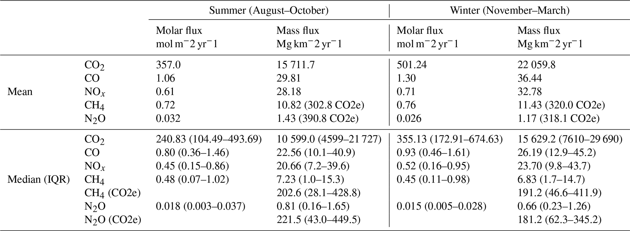 Table 6Summary of species fluxes. Results are split by season (August–October and November–March) and given for the median day (based on hourly medians) and mean day (based on hourly means). Results are presented as molar fluxes in mol m−2 yr−1 and mass fluxes in Mg km−2 yr−1. For mass fluxes of CH4 and N2O the CO2 equivalent (CO2e) mass flux is also given using 100-year global warming potential factors of 28 (CH4) and 273 (N2O) (Forster et al., 2021).